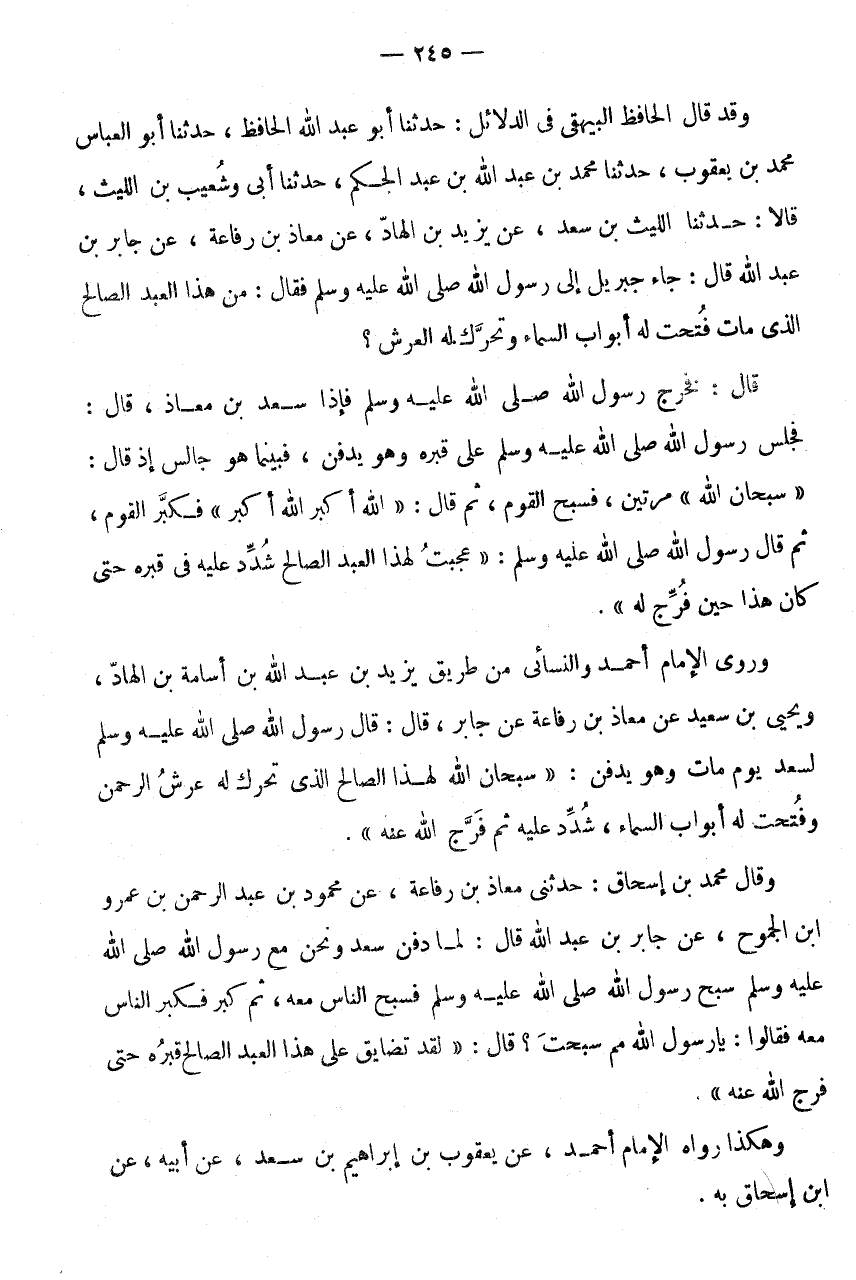 وَقَدْ قَالَ الْحَافِظُ الْبَيْهَقِيُّ فِي الدَّلَائِلِ: حَدَّثَنَا أَبُو عَبْدِ اللَّهِ الْحَافِظُ، حَدَّثَنَا أَبُو الْعَبَّاسِ مُحَمَّدُ بْنُ يَعْقُوبَ، حَدَّثَنَا مُحَمَّدُ بْنُ عَبْدِ اللَّهِ بْنُ عَبْدِ الْحَكَمِ، حَدَّثَنَا أَبِي وَشُعَيْبُ بْنُ اللَّيْثِ، قَالَا: حَدَّثَنَا اللَّيْثِ بْنِ سَعْدٍ، عَنْ يَزِيدَ بْنِ الْهَادِ، عَنْ مُعَاذِ بْنِ رِفَاعَةَ، عَنْ جَابِرِ بْنِ عَبْدِ اللَّهِ قَالَ: جَاءَ جِبْرِيلُ إِلَى رَسُولِ اللَّهِ صَلَّى اللَّهُ عَلَيْهِ وَسَلَّمَ فَقَالَ: مَنْ هَذَا الْعَبْدُ الصَّالِحُ الَّذِي مَاتَ فتحت لَهُ أَبْوَابُ السَّمَاءِ وَتَحَرَّكَ لَهُ الْعَرْشُ؟ قَالَ: فَخَرَجَ رَسُولُ اللَّهِ صَلَّى اللَّهُ عَلَيْهِ وَسَلَّمَ فَإِذَا سَعْدُ بْنُ مُعَاذٍ، قَالَ: فَجَلَسَ رَسُولُ اللَّهِ صَلَّى اللَّهُ عَلَيْهِ وَسَلَّمَ عَلَى قَبْرِهِ وَهُوَ يُدْفَنُ، فَبَيْنَمَا هُوَ جَالِسٌ إِذْ قَالَ: " سُبْحَانَ اللَّهِ " مَرَّتَيْنِ، فَسَبَّحَ الْقَوْمُ، ثُمَّ قَالَ: " الله أكبر الله أكبر " فَكبر الْقَوْم، ثُمَّ قَالَ رَسُولُ اللَّهِ صَلَّى اللَّهُ عَلَيْهِ وَسَلَّمَ: " عَجِبْتُ لِهَذَا الْعَبْدِ الصَّالِحِ شُدِّدَ عَلَيْهِ فِي قَبْرِهِ حَتَّى كَانَ هَذَا حِينَ فُرِّجَ لَهُ ".
