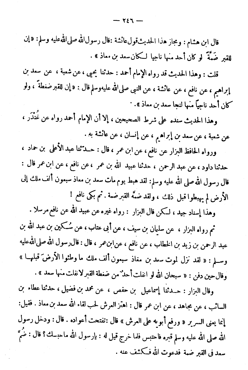 قَالَ ابْنُ هِشَامٍ: وَمَجَازُ هَذَا الْحَدِيثِ قَوْلُ عَائِشَةُ: قَالَ رَسُولُ اللَّهِ صَلَّى اللَّهُ عَلَيْهِ وَسَلَّمَ: " إِنَّ لِلْقَبْرِ ضَمَّةً لَوْ كَانَ أَحَدٌ مِنْهَا نَاجِيًا لَكَانَ سَعْدَ بْنَ مُعَاذٍ ".