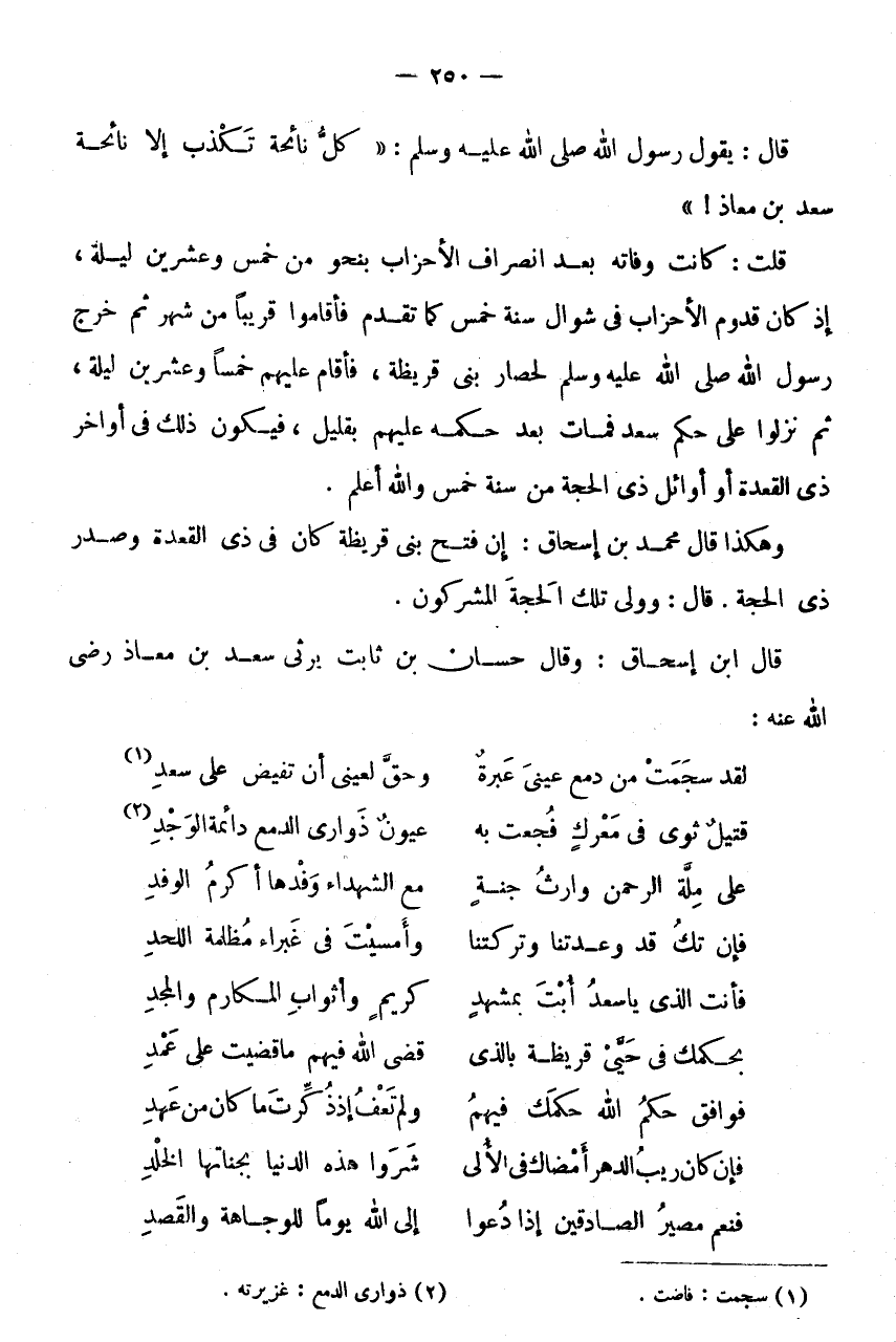 لَقَدْ سَجَمَتْ مِنْ دَمْعِ عَيْنِيَ عَبْرَةٌ * وَحُقَّ لِعَيْنِي أَنْ تَفِيضَ عَلَى سَعْدٍ (1) قَتِيلٌ ثَوَى فِي مَعْرَكٍ فُجِعَتْ بِهِ * عُيُونٌ ذَوَارِي الدَّمْعِ دَائِمَةُ الْوَجْدِ (2) عَلَى مِلَّةِ الرَّحْمَنِ وَارِثِ جَنَّةٍ * مَعَ الشُّهَدَاءِ وَفْدُهَا أكْرم الْوَفْد فَإِن تَكُ قد وعدتنا وَتَرَكْتَنَا * وَأَمْسَيْتَ فِي غَبْرَاءَ مُظْلِمَةِ اللَّحْدِ فَأَنْتَ الَّذِي يَا سَعْدُ أُبْتَ بِمَشْهَدٍ * كَرِيمٍ وَأَثْوَابِ المكارم وَالْمجد بِحُكْمِكَ فِي حَيَّيْ قُرَيْظَةَ بِالَّذِي * قَضَى اللَّهُ فِيهِمْ مَا قَضَيْتَ عَلَى عَمْدِ فَوَافَقَ حُكْمَ اللَّهِ حُكْمُكَ فِيهِمُ * وَلَمْ تَعْفُ إِذْ ذُكِّرْتَ مَا كَانَ مِنْ عَهْدِ فَإِنْ كَانَ رَيْبُ الدَّهْرِ أَمْضَاكَ فِي الْأُلَى * شَرَوْا هَذِهِ الدُّنْيَا بِجَنَّاتِهَا الْخُلْدِ فَنِعْمَ مَصِيرُ الصَّادِقِينَ إِذَا دُعُوا * إِلَى الله يَوْمًا للوجاهة وَالْقَصْد