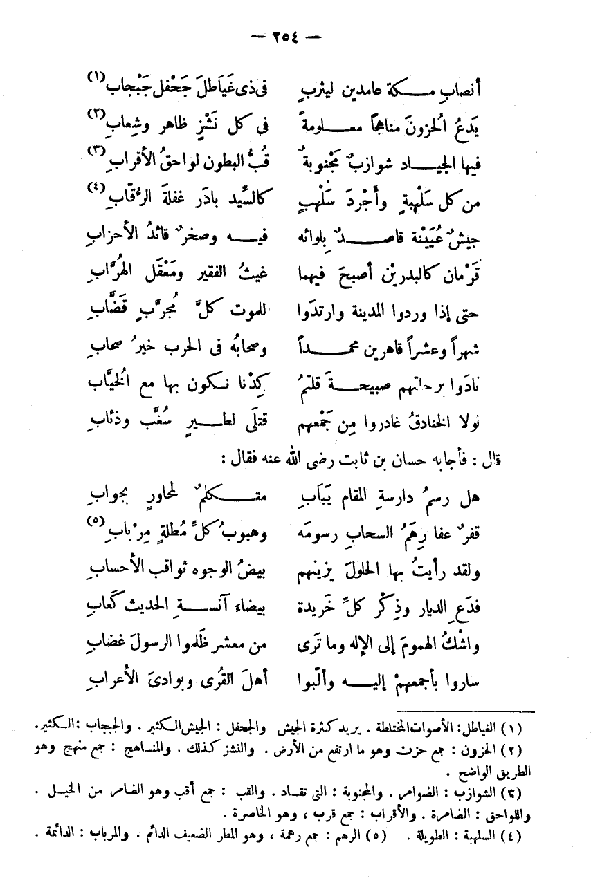 نَادَوْا بِرِحْلَتِهِمْ صَبِيحَةَ قُلْتُمُ * كِدْنَا نَكُونُ بِهَا مَعَ الْخُيَّابِ لَوْلَا الْخَنَادِقُ غَادَرُوا مِنْ جَمْعِهِمْ * قَتْلَى لطير سغب وذئاب قَالَ: فَأَجَابَهُ حسان ن بْنُ ثَابِتٍ رَضِيَ اللَّهُ عَنْهُ فَقَالَ: هَلْ رَسْمُ دَارِسَةِ الْمُقَامِ يَبَابِ * مُتَكَلِّمٌ لِمُحَاوِرٍ بِجَوَابِ قَفْرٌ عَفَا رِهَمُ السَّحَابِ رُسُومَهُ * وَهُبُوبُ كُلِّ مُطِلَّةٍ مِرْبَابِ (5) وَلَقَدْ رَأَيْتُ بِهَا الْحُلُولَ يُزِينُهُمْ * بيض الْوُجُوه ثواقب الاحساب فدع الدِّيَارَ وَذِكْرَ كُلِّ خَرِيدَةٍ * بَيْضَاءَ آنِسَةِ الْحَدِيثِ كَعَابِ وَاشْكُ الْهُمُومَ إِلَى الْإِلَهِ وَمَا تَرَى * من معشر ظلمُوا الرَّسُول غضاب سَارُوا بأجمعهم إِلَيْهِ وألبوا * أهل الْقرى وبوادي الاعراب