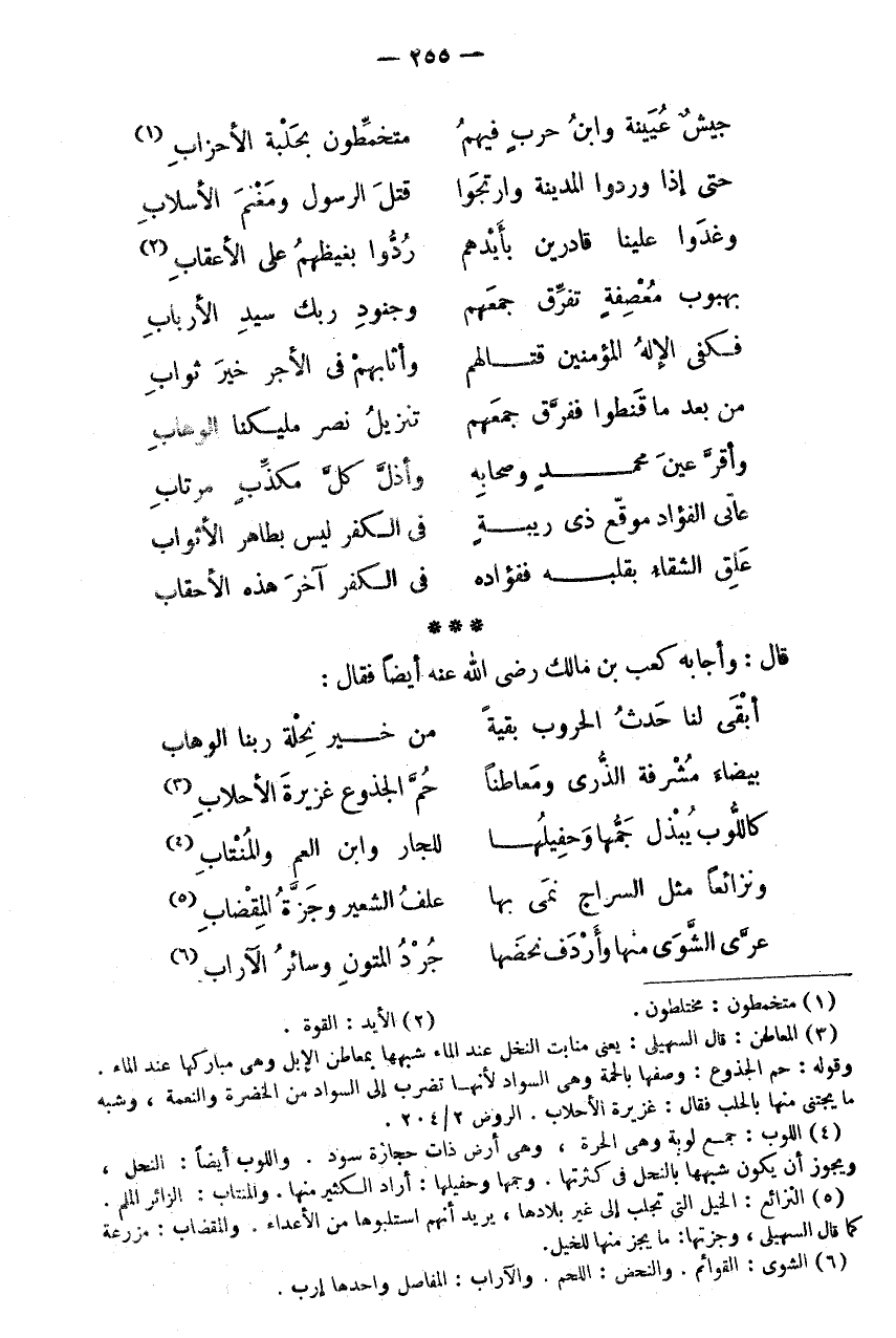 وَأَقَرَّ عَيْنَ مُحَمَّدٍ وَصِحَابِهِ * وَأَذَلَّ كُلَّ مُكَذِّبٍ مُرْتَابِ عَاتِي الْفُؤَادِ مُوَقَّعٍ ذِي رِيبَةٍ * فِي الْكُفْرِ لَيْسَ بِطَاهِرِ الْأَثْوَابِ عَلِقَ الشَّقَاءُ بِقَلْبِهِ فَفُؤَادُهُ * فِي الْكُفْرِ آخِرَ هَذِهِ الْأَحْقَابِ * * * قَالَ: وَأَجَابَهُ كَعْبُ بْنُ مَالِكٍ رَضِيَ اللَّهُ عَنْهُ أَيْضًا فَقَالَ: أَبْقَى لَنَا حَدَثُ الْحُرُوبِ بَقِيَّةً * مِنْ خَيْرِ نِحْلَةِ رَبِّنَا الْوَهَّابِ بَيْضَاءَ مُشْرِفَةِ الذُّرَى وَمَعَاطِنًا * حُمَّ الْجُذُوعِ غَزِيرَةَ الْأَحْلَابِ (3) كَاللُّوبِ يُبْذَلُ جَمُّهَا وَحَفِيلُهَا * لِلْجَارِ وَابْن الْعم والمنتاب (4) ونزائعا مثل السراج نَمَى بِهَا * عَلَفُ الشَّعِيرِ وَجَزَّةُ الْمِقْضَابِ (5) عَرِيَ الشَّوَى مِنْهَا وَأَرْدَفَ نَحْضَهَا * جُرْدَ الْمُتُونِ وَسَائِرِ الْآرَاب (6)
