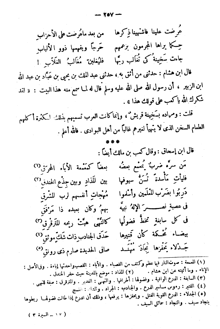 * * * قَالَ ابْنُ إِسْحَاقَ: وَقَالَ كَعْبُ بْنُ مَالِكٍ أَيْضًا: مَنْ سَرَّهُ ضَرْبٌ يُمَعْمِعُ بَعْضُهُ * بَعْضًا كَمَعْمَعَةِ الْأَبَاءِ الْمُحْرَقِ (1) فَلْيَأْتِ مَأْسَدَةً تَسُنُّ سُيُوفَهَا * بَيْنَ الْمَذَادِ وَبَيْنَ جذع الْخَنْدَقِ (2) دَرِبُوا بِضَرْبِ الْمُعْلِمِينَ وَأَسْلَمُوا * مُهَجَاتِ أَنْفُسِهِمْ لِرَبِّ الْمَشْرِقِ فِي عُصْبَةٍ نَصَرَ الْإِلَهُ نَبِيَّهُ * بِهَمُ وَكَانَ بِعَبْدِهِ ذَا مَرْفَقِ فِي كُلِّ سابغة تخط فُضُولُهَا * كَالنَّهْيِ هَبَّتْ رِيحُهُ الْمُتَرَقْرِقِ (3) بَيْضَاءَ مُحْكَمَةً كَأَنَّ قَتِيرَهَا * حَدَقُ الْجَنَادِبِ ذَاتَ شَكٍّ مُوثَقِ (4) جدلاء يحفزها نجاذ مهند * صافي الحديدة صارم ذِي رونق (5)