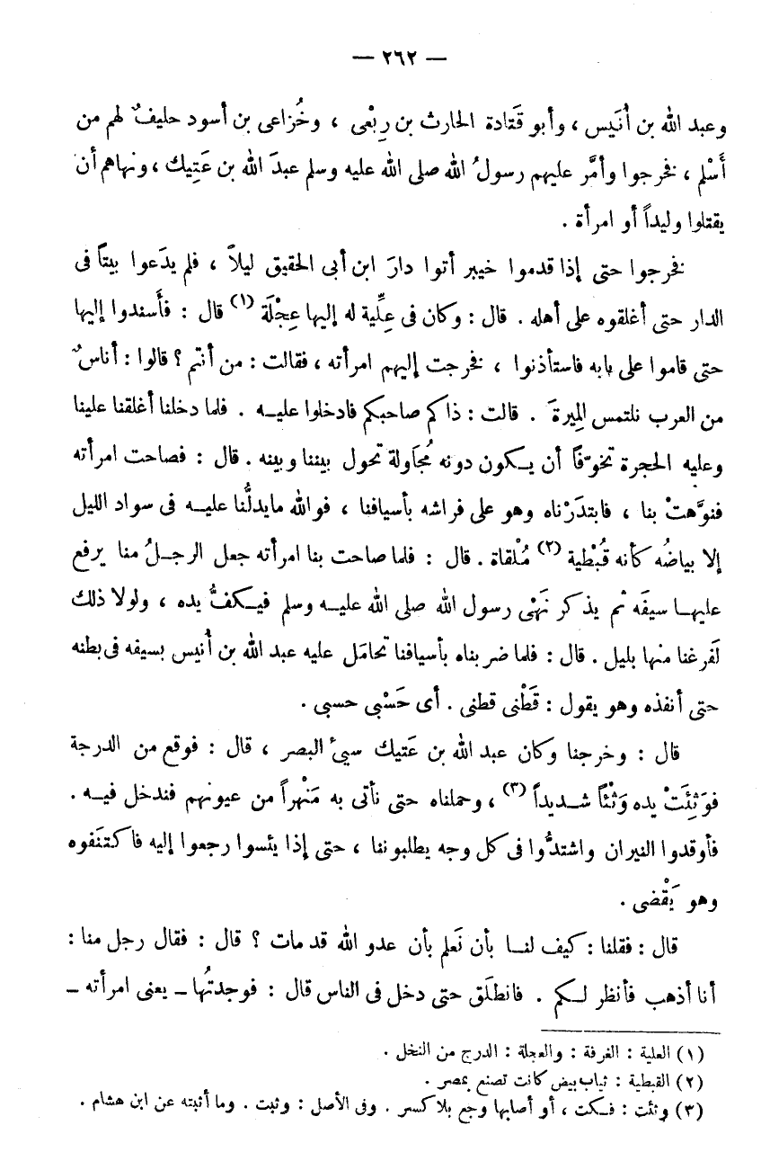وَعَبْدُ اللَّهِ بْنُ أُنَيْسٍ، وَأَبُو قَتَادَةَ الْحَارِثُ بْنُ رِبْعِيٍّ، وَخُزَاعِيُّ بْنُ أَسْوَدَ حَلِيفٌ لَهُمْ مِنْ أَسْلَمَ، فَخَرَجُوا وَأَمَّرَ عَلَيْهِمْ رَسُولُ اللَّهِ صَلَّى اللَّهُ عَلَيْهِ وَسَلَّمَ عَبْدَ اللَّهِ بْنَ عَتِيكٍ، وَنَهَاهُمْ أَنْ يَقْتُلُوا وَلِيدًا أَوِ امْرَأَةً.