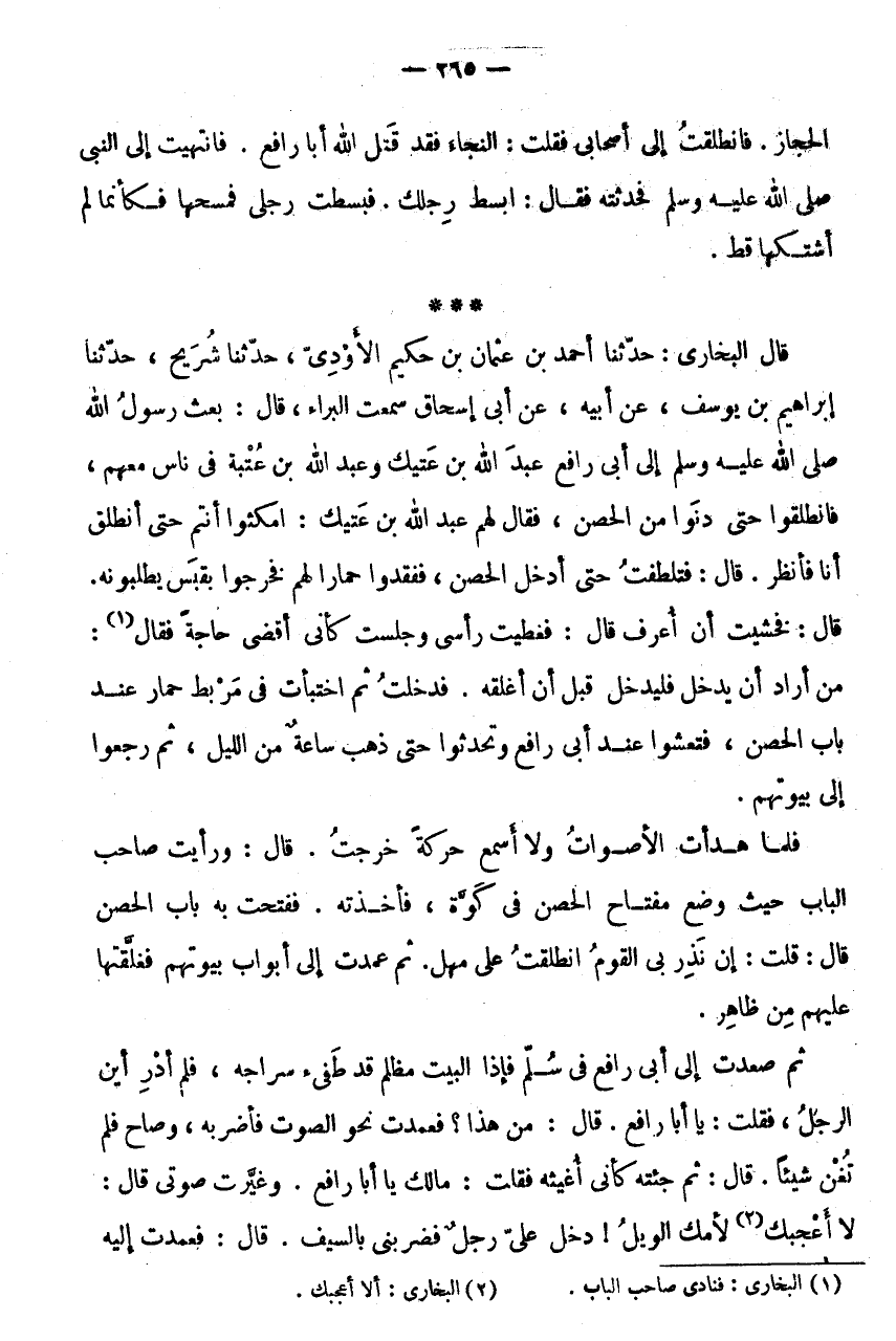 * * * قَالَ الْبُخَارِيُّ: حَدَّثَنَا أَحْمَدُ بْنُ عُثْمَانَ بْنِ حَكِيمٍ الْأَوْدِيُّ، حَدَّثَنَا شُرَيْحٌ، حَدَّثَنَا إِبْرَاهِيمُ بْنُ يُوسُفَ، عَنْ أَبِيهِ، عَنْ أَبِي إِسْحَاقَ سَمِعْتُ الْبَراء، قَالَ: بُعِثَ رَسُولُ اللَّهِ صَلَّى اللَّهُ عَلَيْهِ وَسَلَّمَ إِلَى أَبِي رَافِعٍ عَبْدَ اللَّهِ بْنَ عَتِيكٍ وَعَبْدَ اللَّهِ بْنَ عُتْبَةَ فِي نَاسٍ مَعَهُمْ، فَانْطَلَقُوا حَتَّى دَنَوْا مِنَ الْحِصْنِ، فَقَالَ لَهُمْ عَبْدُ اللَّهِ بْنُ عَتِيكٍ: امْكُثُوا أَنْتُمْ حَتَّى أَنْطَلِقَ أَنَا فَأَنْظُرَ.