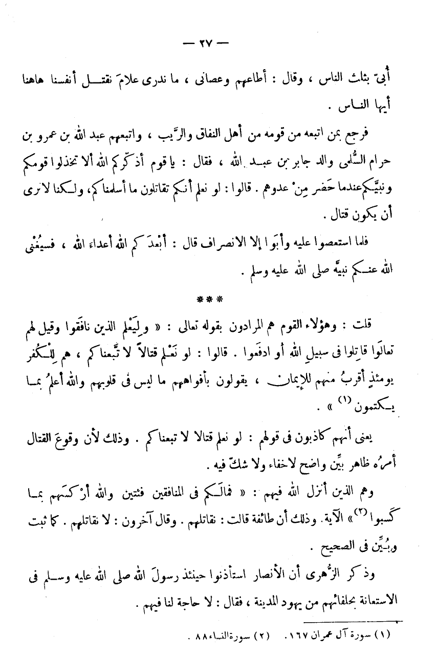 فَرَجَعَ بِمَنِ اتَّبَعَهُ مِنْ قَوْمِهِ مِنْ أَهْلِ النِّفَاقِ وَالرَّيْبِ، وَاتَّبَعَهُمْ عَبْدُ اللَّهِ بْنُ عَمْرِو بْنِ حَرَامٍ السُّلَمِيُّ وَالِدُ جَابِرِ بْنِ عَبْدِ اللَّهِ، فَقَالَ: يَا قَوْمِ أُذَكِّرُكُمُ الله أَلا تخذلوا قومكم ونبيكم عِنْدَمَا حَضَرَ مِنْ عَدُوِّهِمْ.
