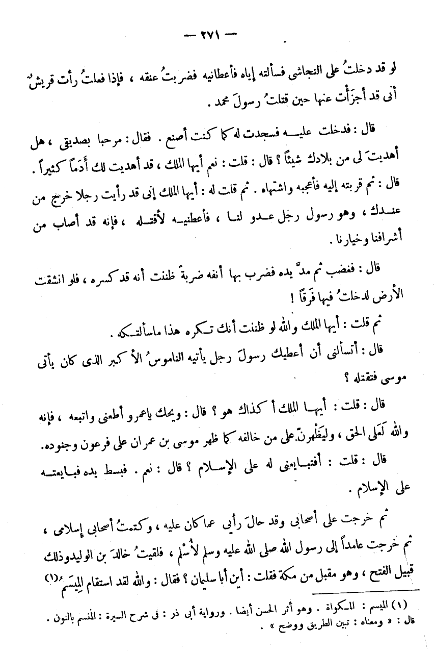 قَالَ: أَتَسْأَلُنِي أَنْ أُعْطِيَكَ رَسُولَ رَجُلٍ يَأْتِيهِ النَّامُوسُ الْأَكْبَرُ الَّذِي كَانَ يَأْتِي مُوسَى فتقتله؟ قَالَ: قُلْتُ: أَيُّهَا الْمَلِكُ أَكَذَاكَ هُوَ؟ قَالَ: وَيْحَكَ يَا عَمْرُو أَطِعْنِي وَاتَّبِعْهُ، فَإِنَّهُ وَاللَّهِ لَعَلَى الْحَقِّ، وَلَيَظْهَرَنَّ عَلَى مَنْ خَالَفَهُ كَمَا ظَهَرَ مُوسَى بْنُ عِمْرَانَ عَلَى فِرْعَوْنَ وَجُنُودِهِ.