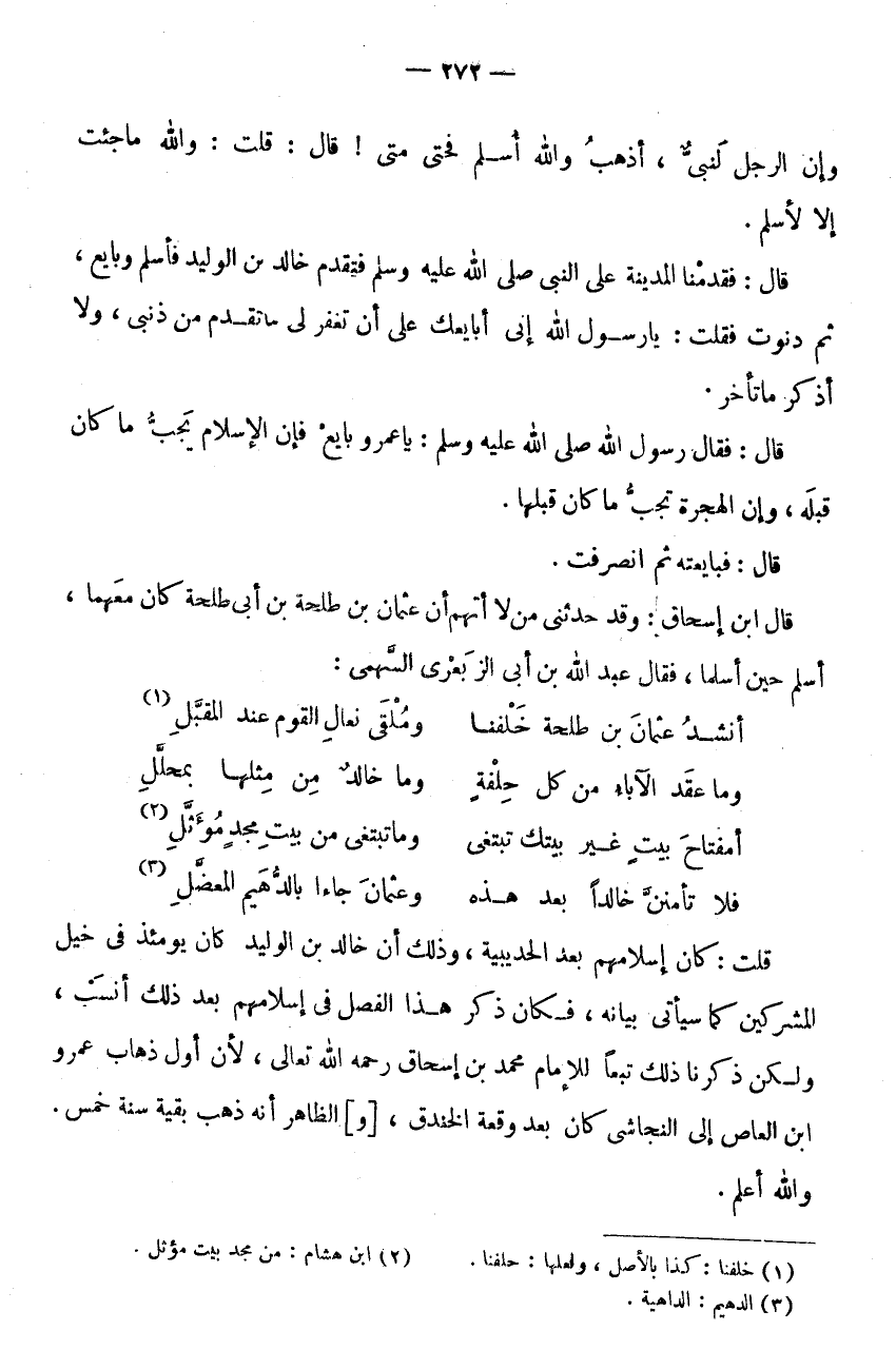 أَسْلَمَ حِينَ أَسْلَمَا، فَقَالَ عَبْدُ اللَّهِ بْنُ أَبِي الزِّبَعْرَى السَّهْمِيُّ: أنْشد عُثْمَان بن طَلْحَة خلفنا * وَمُلْقَى نِعَالِ الْقَوْمِ عِنْدَ الْمُقَبَّلِ (1) وَمَا عَقَدَ الْآبَاءُ مِنْ كُلِّ حِلْفَةٍ * وَمَا خَالِدٌ مِنْ مِثْلِهَا بِمُحَلَّلِ أَمِفْتَاحَ بَيْتٍ غَيْرِ بَيْتِكَ تَبْتَغِي * وَمَا تَبْتَغِي مِنْ بَيْتِ مَجْدٍ مُؤَثَّلٍ (2) فَلَا تَأْمَنَنَّ خَالِدًا بَعْدَ هَذِهِ * وَعُثْمَانَ جَاءَا بِالدُّهَيْمِ الْمُعَضَّلِ (3) قُلْتُ: كَانَ إِسْلَامُهُمْ بَعْدَ الْحُدَيْبِيَةِ، وَذَلِكَ أَنَّ خَالِدَ بْنَ الْوَلِيدِ كَانَ يَوْمَئِذٍ فِي خَيْلِ الْمُشْرِكِينَ كَمَا سَيَأْتِي بَيَانُهُ، فَكَانَ ذِكْرُ هَذَا الْفَصْلِ فِي إِسْلَامِهِمْ بَعْدَ ذَلِكَ أَنْسَبَ، وَلَكِنْ ذَكَرْنَا ذَلِكَ تَبَعًا لِلْإِمَامِ مُحَمَّدِ بْنِ إِسْحَاقَ رَحِمَهُ اللَّهُ تَعَالَى، لِأَنَّ أَوَّلَ ذَهَابِ عَمْرو ابْن الْعَاصِ إِلَى النَّجَاشِيِّ كَانَ بَعْدَ وَقْعَةِ الْخَنْدَقِ، [و] الظَّاهِر أَنه ذهب بَقِيَّة سنة خمس وَالله أعلم.