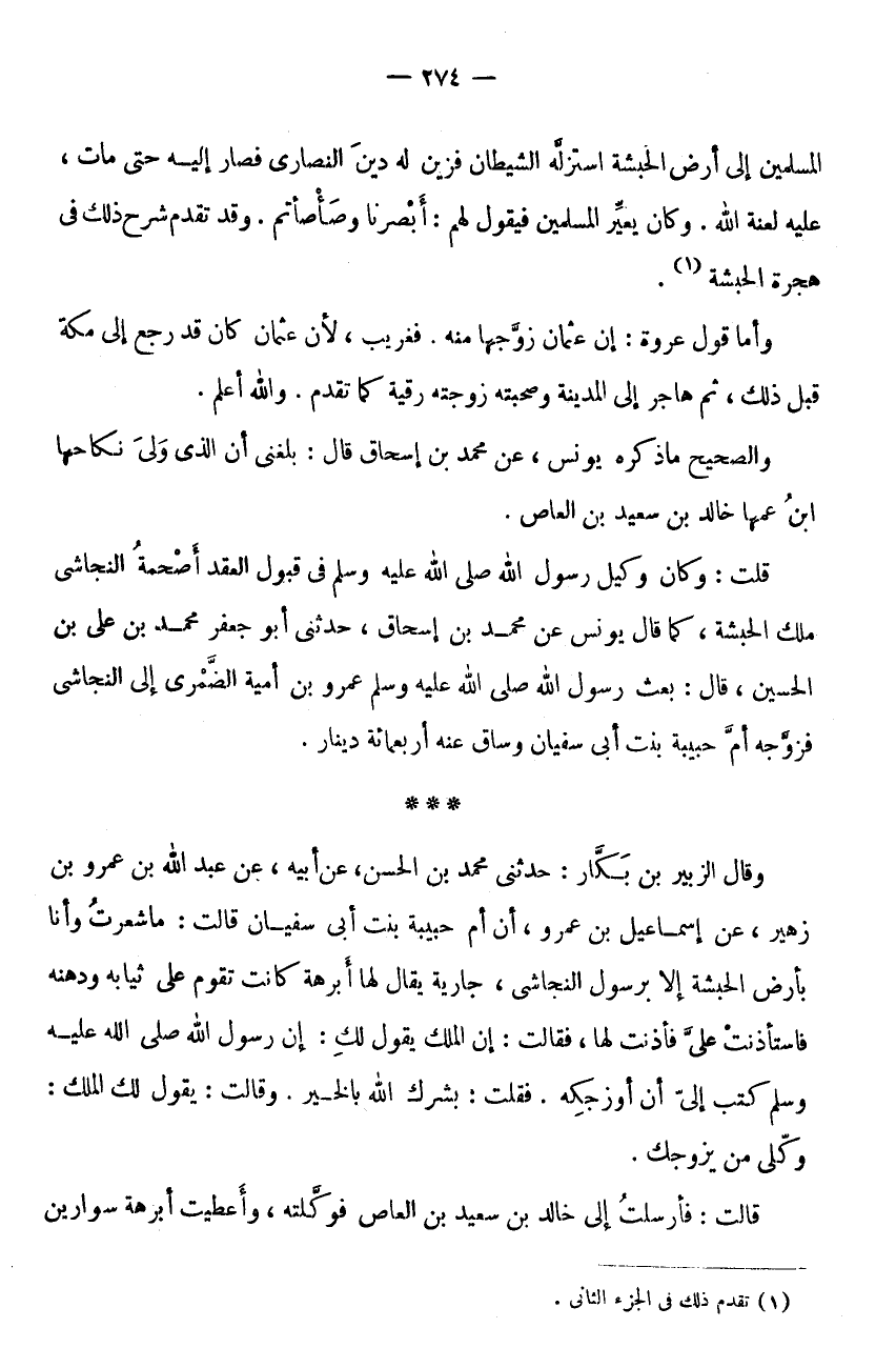 * * * وَقَالَ الزُّبَيْرُ بْنُ بَكَّارٍ: حَدَّثَنِي مُحَمَّدُ بْنُ الْحَسَنِ، عَنْ أَبِيهِ، عَنْ عَبْدِ اللَّهِ بْنِ عَمْرِو بْنِ زُهَيْرٍ، عَنْ إِسْمَاعِيلَ بْنِ عَمْرٍو، أَنَّ أُمَّ حَبِيبَةَ بِنْتَ أَبِي سُفْيَانَ قَالَتْ: مَا شَعَرْتُ وَأَنَا بِأَرْضِ الْحَبَشَةِ إِلَّا بِرَسُولِ النَّجَاشِيِّ، جَارِيَةٍ يُقَالُ لَهَا أَبَرْهَةُ كَانَتْ تَقُومُ عَلَى ثِيَابِهِ وَدُهْنِهِ فَاسْتَأْذَنَتْ عَلَيَّ فَأَذِنْتُ لَهَا، فَقَالَتْ: إِنَّ الْمَلِكَ يَقُولُ لَكِ: إِنَّ رَسُولَ اللَّهِ صَلَّى اللَّهُ عَلَيْهِ وَسَلَّمَ كتب إِلَيّ أَن أوزجكه.