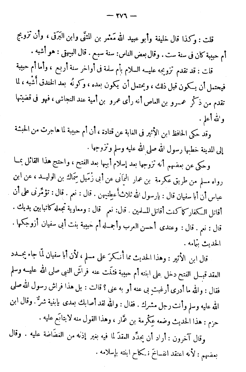 قُلْتُ: قَدْ تَقَدَّمَ تَزْوِيجُهُ عَلَيْهِ السَّلَامُ بِأُمِّ سَلَمَةَ فِي أَوَاخِرِ سَنَةِ أَرْبَعٍ، وَأَمَّا أُمُّ حَبِيبَةَ فَيَحْتَمِلُ أَنْ يَكُونَ قَبْلَ ذَلِكَ، وَيَحْتَمِلُ أَنْ يَكُونَ بَعْدَهُ، وَكَوْنُهُ بَعْدَ الْخَنْدَقِ أَشْبَهُ، لِمَا تَقَدَّمَ مِنْ ذِكْرِ عَمْرِو بْنِ الْعَاصِ أَنَّهُ رَأَى عَمْرَو بْنَ أُمَيَّةَ عِنْدَ النَّجَاشِيِّ، فَهُوَ فِي قَضِيَّتِهَا وَاللَّهُ أَعْلَمُ.