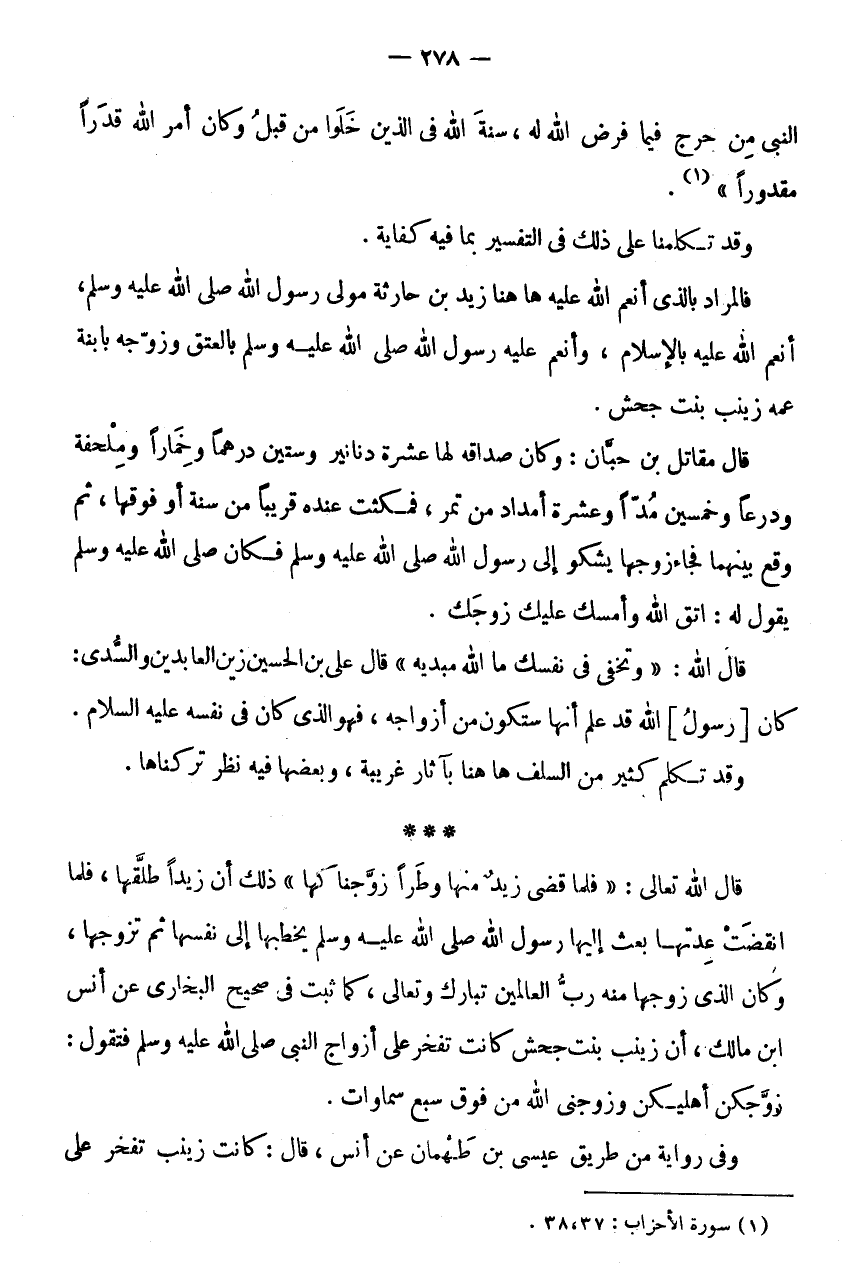 النَّبِيِّ مِنْ حَرَجٍ فِيمَا فَرَضَ اللَّهُ لَهُ، سُنَّةَ اللَّهِ فِي الَّذِينَ خَلَوْا مِنْ قَبْلُ وَكَانَ أَمر الله قدرا مَقْدُورًا " (1) .