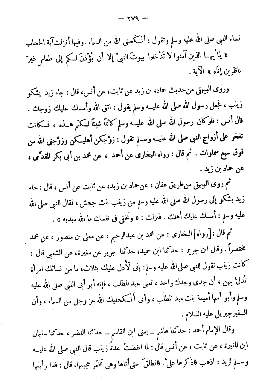 نِسَاءِ النَّبِيِّ صَلَّى اللَّهُ عَلَيْهِ وَسَلَّمَ وَتَقُولُ: أَنْكَحَنِيَ اللَّهُ مِنَ السَّمَاءِ وَفِيهَا أُنْزِلَتْ آيَةُ الْحجاب " يأيها الَّذِينَ آمَنُوا لَا تَدْخُلُوا بُيُوتَ النَّبِيِّ إِلَّا أَنْ يُؤْذَنَ لَكُمْ إِلَى طَعَامٍ غَيْرَ نَاظِرِينَ إناه " الْآيَة.