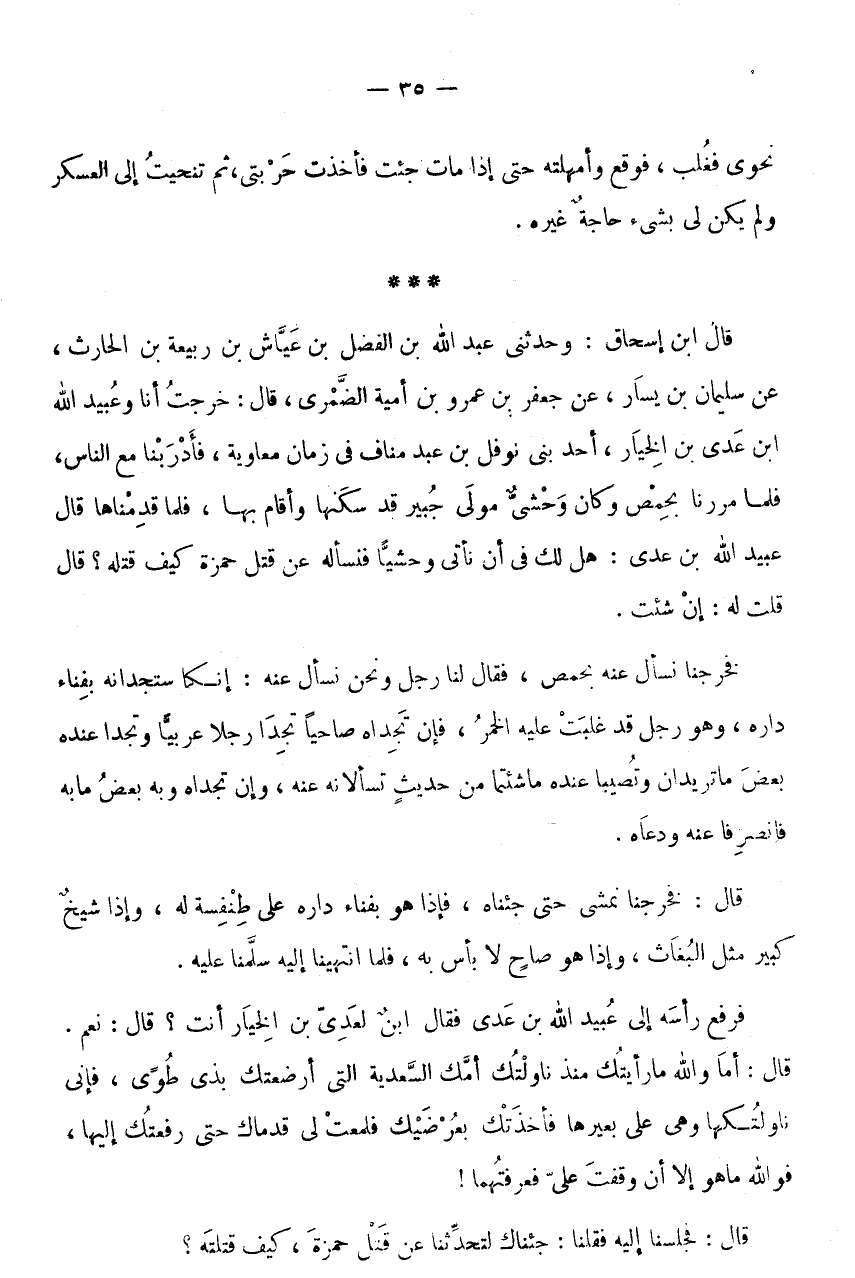 * * * قَالَ ابْنُ إِسْحَاقَ: وَحَدَّثَنِي عَبْدُ اللَّهِ بْنُ الْفضل بن عَيَّاش بْنِ رَبِيعَةَ بْنِ الْحَارِثِ، عَنْ سُلَيْمَانَ بْنِ يَسَارٍ، عَنْ جَعْفَرِ بْنِ عَمْرِو بْنِ أُمَيَّةَ الضمرى، قَالَ: خرجت أَنا وَعبيد الله ابْن عَدِيِّ بْنِ الْخِيَارِ، أَحَدُ بَنِي نَوْفَلِ بْنِ عبد منَاف فِي زمَان مُعَاوِيَة، فأدر بِنَا مَعَ النَّاسِ، فَلَمَّا مَرَرْنَا بِحِمْصَ وَكَانَ وَحْشِيُّ مَوْلَى جُبَيْرٍ قَدْ سَكَنَهَا وَأَقَامَ بِهَا، فَلَمَّا قَدِمْنَاهَا قَالَ عُبَيْدُ اللَّهِ بْنُ عَدِيٍّ: هَلْ لَكَ فِي أَنْ نَأْتِيَ وَحْشِيًّا فَنَسْأَلُهُ عَنْ قَتْلِ حَمْزَةَ كَيْفَ قَتَلَهُ؟ قَالَ قُلْتُ لَهُ: إِنْ شِئْتَ.
