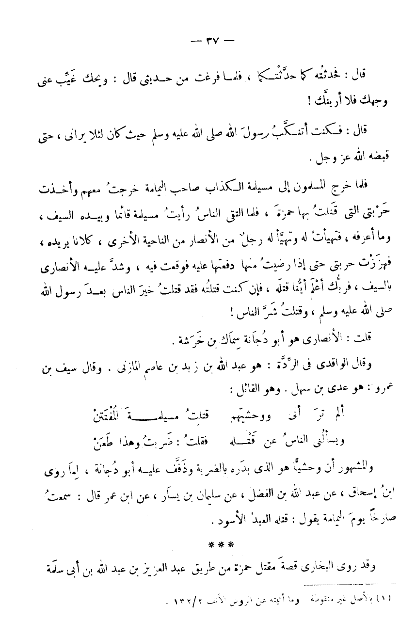 وَهُوَ الْقَائِلُ: أَلَمْ تَرَ أَنِّي وَوَحْشِيَّهُمْ * قَتَلْتُ مُسَيْلِمَةَ الْمُفْتَتَنْ وَيَسْأَلُنِي النَّاسُ عَنْ قَتْلِهِ * فَقُلْتُ: ضَرَبْتُ وَهَذَا طَعَنْ وَالْمَشْهُورُ أَنَّ وَحْشِيًّا هُوَ الَّذِي بَدَرَهُ بِالضَّرْبَةِ وَذَفَّفَ عَلَيْهِ أَبُو دُجَانَةَ، لِمَا رَوَى ابْنُ إِسْحَاقَ، عَنْ عَبْدِ اللَّهِ بْنِ الْفَضْلِ، عَنْ سُلَيْمَانَ بْنِ يَسَارٍ، عَنِ ابْنِ عُمَرَ قَالَ: سَمِعْتُ صَارِخًا يَوْمَ الْيَمَامَةِ يَقُولُ: قَتَلَهُ الْعَبْدُ الْأَسْوَدُ.