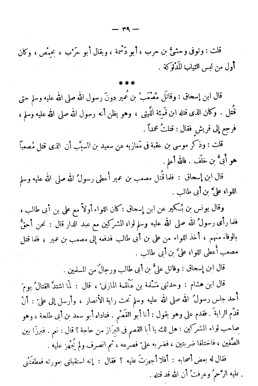 * * * قَالَ ابْنُ إِسْحَاقَ: وَقَاتَلَ مُصْعَبُ بْنُ عُمَيْرٍ دُونَ رَسُولِ اللَّهِ صَلَّى اللَّهُ عَلَيْهِ وَسَلَّمَ حَتَّى قُتِلَ.