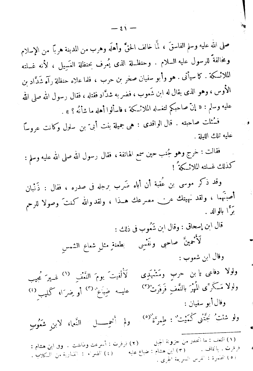 قَالَ ابْن إِسْحَاق: وَقَالَ ابْن شعوب فِي ذَلِك: لَأَحْمِيَنَّ صَاحِبِي وَنَفْسِي * بِطَعْنَةٍ مِثْلِ شُعَاعِ الشَّمْسِ وَقَالَ ابْن شعوب: وَلَوْلَا دفاعي يَابْنَ حَرْبٍ وَمَشْهَدِي * لَأُلْفِيتَ يَوْمَ النَّعْفِ (1) غَيْرَ مُجِيبِ وَلَوْلَا مكرى الْمهْر بالنعف فرفرت (2) * عَلَيْهِ ضِبَاعٌ (3) أَوْ ضِرَاءُ كَلِيبِ (4) وَقَالَ أَبُو سُفْيَانَ: وَلَوْ شِئْتُ نَجَّتْنِي كُمَيْتٌ: طِمِرَّةٌ (5) * وَلَمْ أحمل النعماء لِابْنِ شعوب