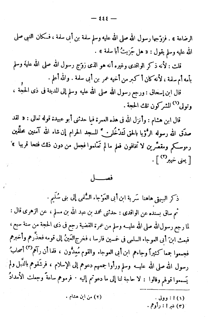 ثُمَّ سَاقَ بِسَنَدِهِ عَنِ الْوَاقِدِيِّ: حَدَّثَنِي مُحَمَّدُ بْنُ عَبْدِ اللَّهِ بْنِ مُسْلِمٍ، عَنِ الزُّهْرِيِّ قَالَ: لَمَّا رَجَعَ رَسُولُ اللَّهِ صَلَّى اللَّهُ عَلَيْهِ وَسَلَّمَ مَنْ عُمْرَةِ الْقَضِيَّةِ رَجَعَ فِي ذِي الْحِجَّةِ مِنْ سَنَةِ سَبْعٍ، فَبَعَثَ ابْنَ أَبِي الْعَوْجَاءِ السُّلَمِيَّ فِي خمسين فَارِسًا، فَخرج الْعَيْنُ إِلَى قَوْمِهِ فَحَذَّرَهُمْ وَأَخْبَرَهُمْ فَجَمَعُوا جَمْعًا كَثِيرًا وَجَاءَهُمُ ابْنُ أَبِي الْعَوْجَاءِ وَالْقَوْمُ مُعِدُّونَ، فَلَمَّا أَنْ رَآهُمْ (3) أَصْحَابُ رَسُولِ اللَّهِ صَلَّى لله عَلَيْهِ وَسَلَّمَ وَرَأَوْا جَمْعَهُمْ دَعَوْهُمْ إِلَى الْإِسْلَامِ، فَرَشَقُوهُمْ بِالنَّبْلِ وَلَمْ