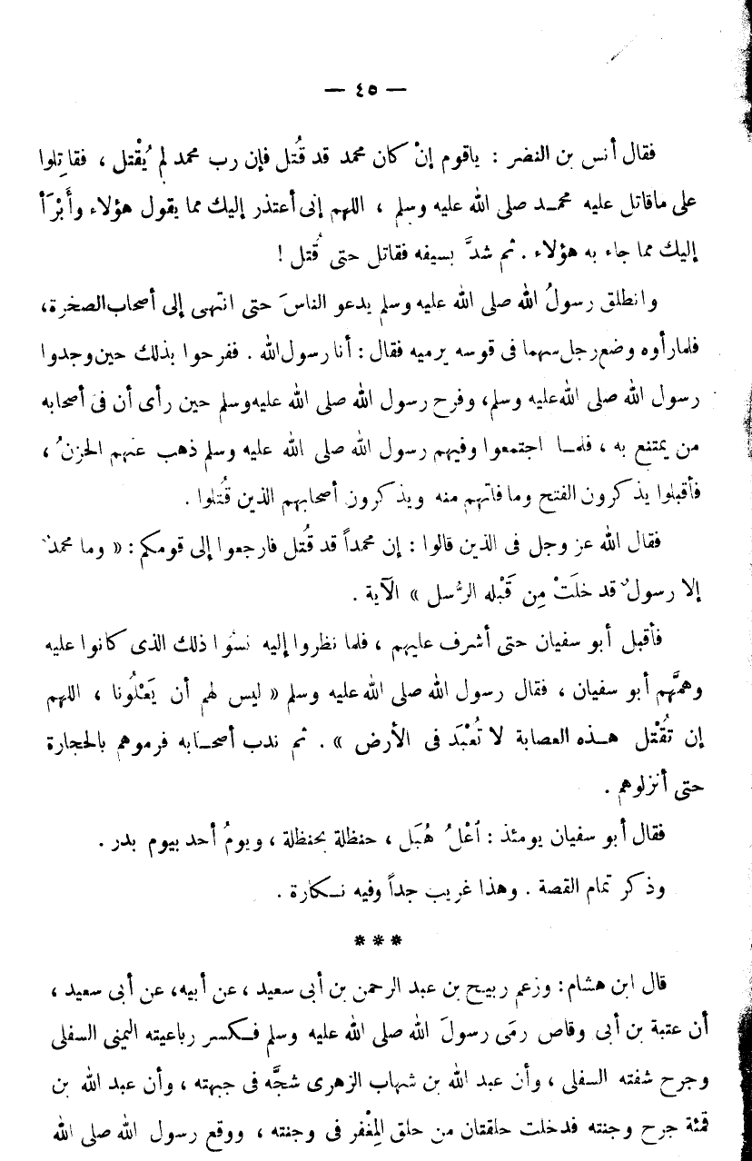 * * * قَالَ ابْنُ هِشَامٍ: وَزَعَمَ رُبَيْحُ بْنُ عَبْدِ الرَّحْمَنِ بْنِ أَبِي سَعِيدٍ، عَنْ أَبِيهِ، عَنْ أَبِي سَعِيدٍ، أَنَّ عُتْبَةَ بْنَ أَبِي وَقَّاصٍ رَمَى رَسُولَ اللَّهِ صَلَّى اللَّهُ عَلَيْهِ وَسَلَّمَ فَكَسَرَ رَبَاعِيَتَهُ الْيُمْنَى السُّفْلَى وَجَرَحَ شِفَتَهُ السُّفْلَى، وَأَنَّ عَبْدَ اللَّهِ بْنَ شِهَابٍ الزُّهْرِيَّ شَجَّهُ فِي جَبْهَتِهِ، وَأَنَّ عَبْدَ اللَّهِ بْنَ قَمِئَةَ جَرَحَ وَجْنَتَهُ فَدَخَلَتْ حَلْقَتَانِ مِنْ حَلَقِ الْمِغْفَرِ فِي وَجْنَتِهِ، وَوَقَعَ رَسُولُ اللَّهِ صَلَّى الله