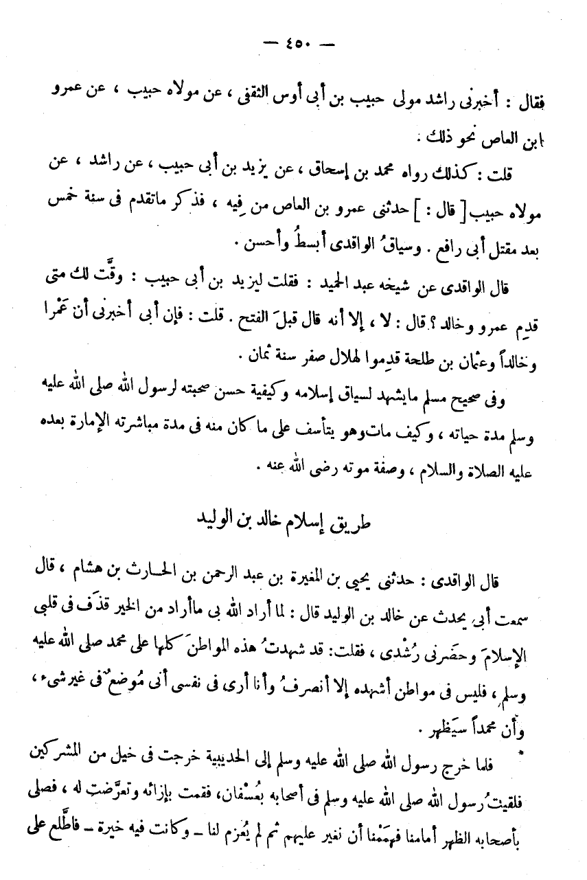 قَالَ الْوَاقِدِيُّ عَنْ شَيْخِهِ عَبْدِ الْحَمِيدِ: فَقُلْتُ لِيَزِيدَ بْنِ أَبِي حَبِيبٍ: وَقَّتَ لَكَ مَتَى قَدِمَ عَمْرٌو وَخَالِدٌ؟ قَالَ: لَا، إِلَّا أَنَّهُ قَالَ قَبْلَ الْفَتْح.