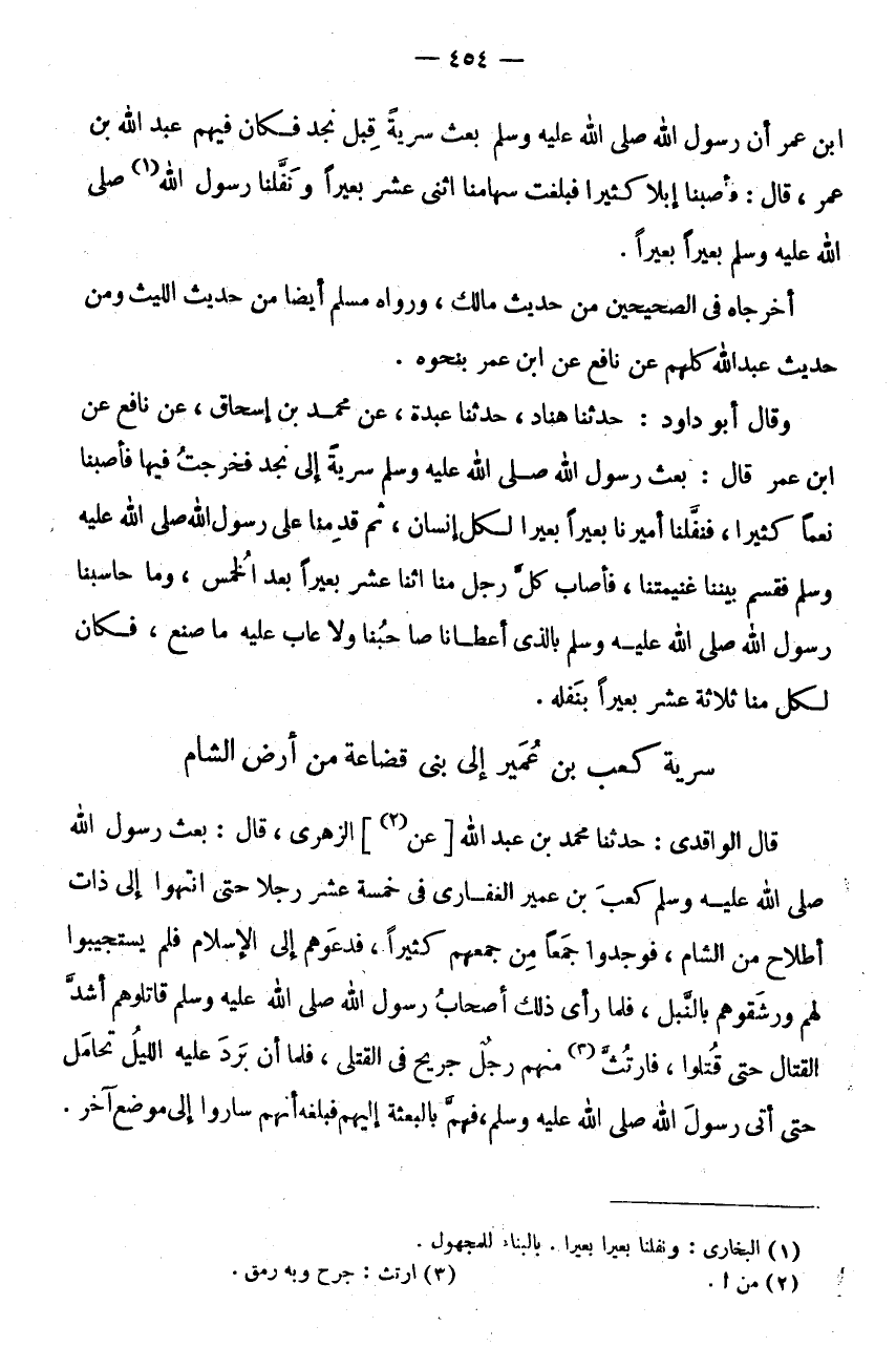 ابْنِ عُمَرَ أَنَّ رَسُولَ اللَّهِ صَلَّى اللَّهُ عَلَيْهِ وَسَلَّمَ بَعَثَ سَرِيَّةً قِبَلَ نَجْدٍ فَكَانَ فِيهِمْ عَبْدُ اللَّهِ بْنُ عُمَرَ، قَالَ فَأَصَبْنَا إِبِلًا كَثِيرًا فَبَلَغَتْ سِهَامُنَا اثْنَيْ عَشَرَ بَعِيرًا ونفلنا رَسُول لله (1) صَلَّى اللَّهُ عَلَيْهِ وَسَلَّمَ بَعِيرًا بَعِيرًا.