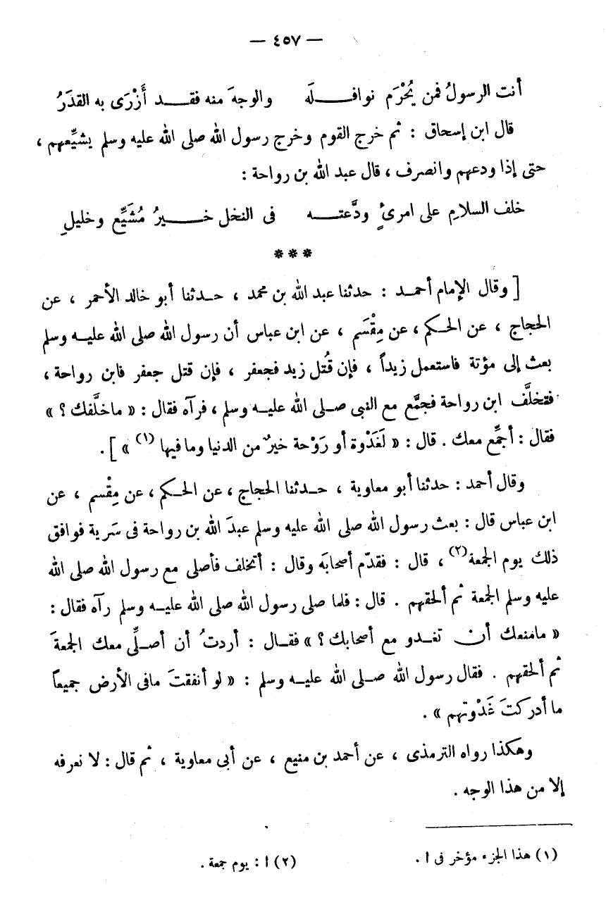 وَقَالَ أَحْمد: حَدثنَا أَبُو مُعَاوِيَة، حَدثنَا الْحجَّاج، عَنِ الْحَكَمِ، عَنْ مِقْسَمٍ، عَنِ ابْنِ عَبَّاسٍ قَالَ: بَعَثَ رَسُولُ اللَّهِ صَلَّى اللَّهُ عَلَيْهِ وَسَلَّمَ عَبْدَ اللَّهِ بْنَ رَوَاحَةَ فِي سَرِيَّةٍ فَوَافَقَ ذَلِكَ يَوْمَ الْجُمُعَةِ (2) ، قَالَ: فَقَدِمَ أَصْحَابَهُ وَقَالَ: أَتَخَلَّفُ فَأُصَلِّي مَعَ رَسُولِ اللَّهِ صَلَّى اللَّهُ عَلَيْهِ وَسَلَّمَ الْجُمُعَةَ ثُمَّ أَلْحَقُهُمْ.