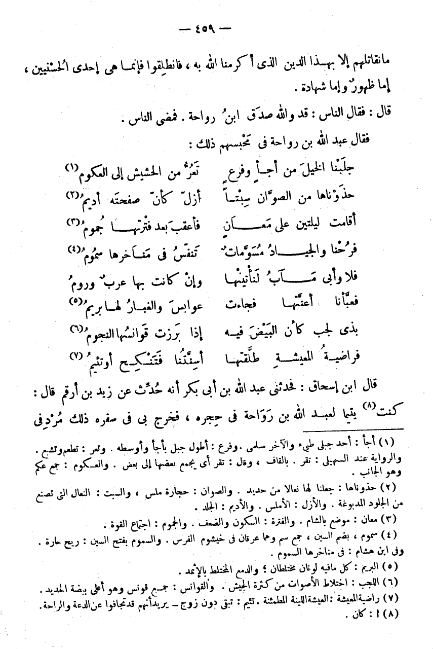فَقَالَ عَبْدُ اللَّهِ بْنُ رَوَاحَةَ فِي مَحْبِسِهِمْ ذَلِك: جلبنا الْخَيل من أجأ وَفرع * تعر من الْحَشِيش إِلَى الْعُكُومُ (1) حَذَوْنَاهَا مِنَ الصَّوَّانِ سِبْتًا * أَزَلَّ كَأَنَّ صَفْحَتَهُ أَدِيمُ (2) أَقَامَتْ لَيْلَتَيْنِ عَلَى مَعَانٍ * فَأُعْقِبَ بَعْدَ فَتْرَتِهَا جُمُومُ (3) فَرُحْنَا وَالْجِيَادُ مُسَوَّمَاتٌ * تَنَفَّسُ فِي مناخرها سموم (4) فَلَا وَأَبِي مَآبَ لَنَأْتِيَنْهَا * وَإِنْ كَانَتْ بِهَا عَرَبٌ وَرُومُ فَعَبَّأْنَا أَعِنَّتَهَا فَجَاءَتْ * عَوَابِسَ وَالْغُبَارُ لَهَا بَرِيمُ (5) بِذِي لَجَبٍ كَأَنَّ الْبِيضَ فِيهِ * إِذَا بَرَزَتْ قَوَانِسُهَا النُّجُومُ (6) فَرَاضِيَةُ الْمَعِيشَةِ طَلَّقَتْهَا * أَسِنَّتُنَا فَتَنْكِحُ أَوْ تَئِيمُ (7) قَالَ ابْنُ إِسْحَاقَ: فَحَدَّثَنِي عَبْدُ اللَّهِ بْنُ أَبِي بَكْرٍ أَنَّهُ حَدَّثَ عَنْ زَيْدِ بْنِ أَرْقَمَ قَالَ: كُنْتُ (8) يَتِيمًا لِعَبْدِ اللَّهِ بْنِ رَوَاحَةَ فِي حِجْرِهِ، فَخرج بِي فِي سَفَره ذَلِك مرد فِي