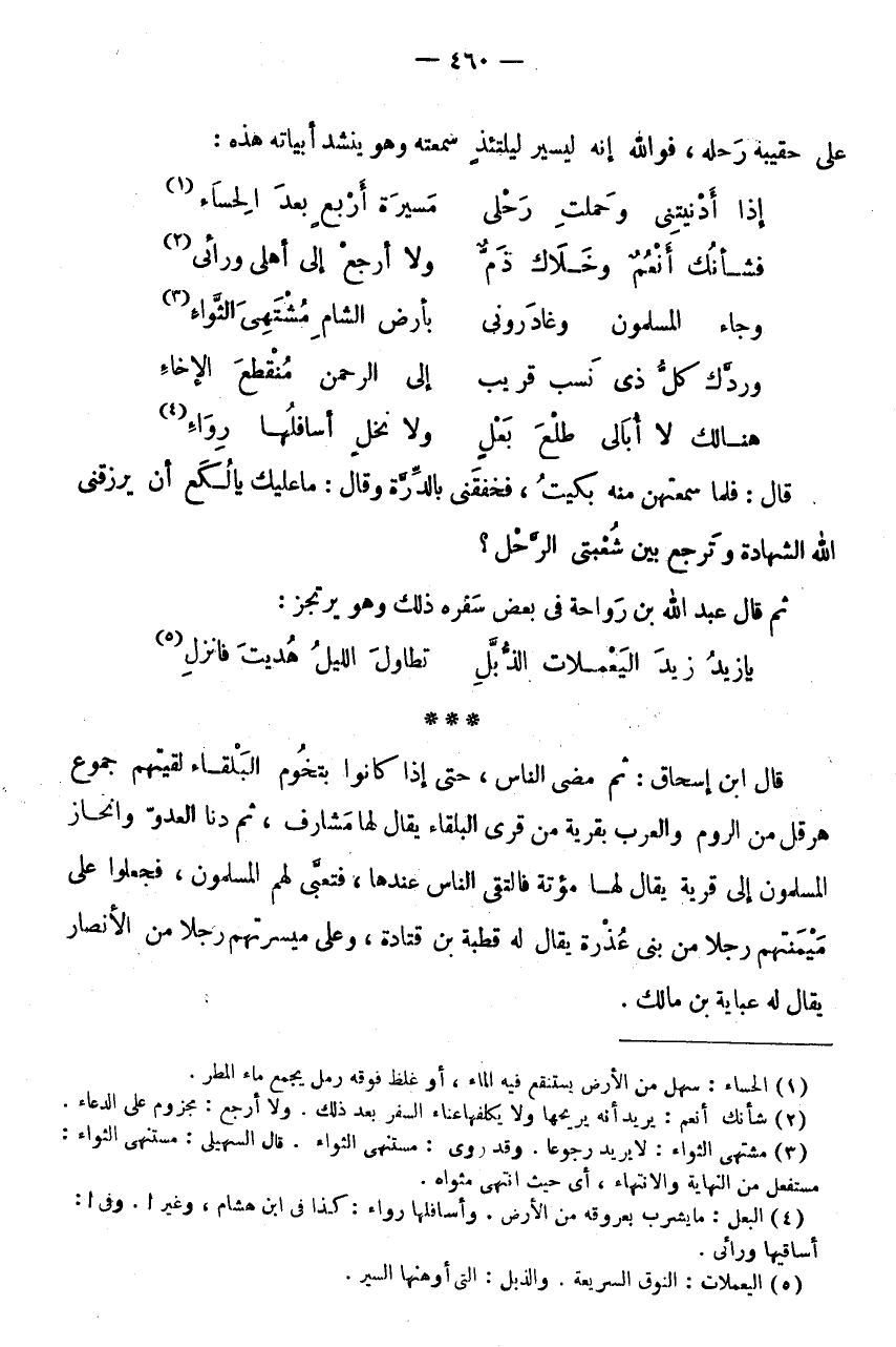 على حقيبة رَحْله، فوَاللَّه إِنَّه ليسير ليلتئذ سمعته وَهُوَ ينشد أبياته هَذِه: إِذا أدنيتني وَحَمَلْتِ رَحْلِي * مَسِيرَةَ أَرْبَعٍ بَعْدَ الْحِسَاءِ (1) فَشَأْنُكِ أَنْعُمٌ وَخَلَاكِ ذَمٌّ * وَلَا أَرْجِعْ إِلَى أَهْلِي وَرَائِي (2) وَجَاءَ الْمُسْلِمُونَ وَغَادَرُونِي * بِأَرْضِ الشَّامِ مُشْتَهِيَ الثَّوَاءِ (3) وَرَدَّكَ كُلُّ ذِي نَسَبٍ قَرِيبٍ * إِلَى الرَّحْمَنِ مُنْقَطِعَ الْإِخَاءِ هُنَالِكَ لَا أُبَالِي طَلْعَ بَعْلٍ * وَلَا نَخْلٍ أَسَافِلُهَا رِوَاءِ (4) قَالَ: فَلَمَّا سَمِعْتُهُنَّ مِنْهُ بَكَيْتُ، فَخَفَقَنِي بِالدِّرَّةِ وَقَالَ: مَا عَلَيْك يالكع أَنْ يَرْزُقَنِي اللَّهُ الشَّهَادَةَ وَتَرْجِعَ بَيْنَ شُعْبَتَيِ الرَّحْلِ؟ ثُمَّ قَالَ عَبْدُ اللَّهِ بْنُ رَوَاحَةَ فِي بَعْضِ سَفَرِهِ ذَلِكَ وَهُوَ يَرْتَجِزُ: يَا زَيْدُ زَيْدَ الْيَعْمَلَاتِ الذُّبَّلِ * تَطَاوَلَ اللَّيْلُ هُدِيتَ فَانْزِلِ (5) * * * قَالَ ابْنُ إِسْحَاقَ: ثُمَّ مَضَى النَّاسُ، حَتَّى إِذَا كَانُوا بِتُخُومِ الْبَلْقَاءِ لَقِيَتْهُمْ جُمُوعُ هِرَقْلَ مِنَ الرُّومِ وَالْعَرَبِ بِقَرْيَةٍ مِنْ قُرَى الْبَلْقَاءِ يُقَالُ لَهَا مَشَارِفُ، ثُمَّ دَنَا الْعَدُوُّ وَانْحَازَ