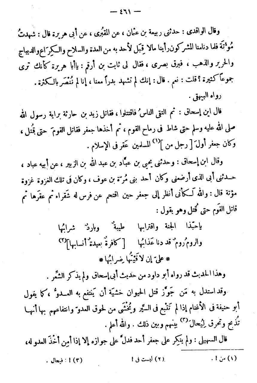 قَاتَلَ الْقَوْمَ حَتَّى قتل وَهُوَ يَقُول: ياحبذا الْجنَّة واقترابها * طيبَة وبارد شَرَابُهَا وَالرُّومُ رُومٌ قَدْ دَنَا عَذَابُهَا * [كَافِرَةٌ بَعِيدَةٌ أَنْسَابُهَا] (2) * عَلَيَّ إِنْ لَاقَيْتُهَا ضِرَابُهَا * وَهَذَا الْحَدِيثُ قَدْ رَوَاهُ أَبُو دَاوُدَ مِنْ حَدِيثِ أَبِي إِسْحَاقَ وَلَمْ يَذْكُرِ الشِّعْرَ.