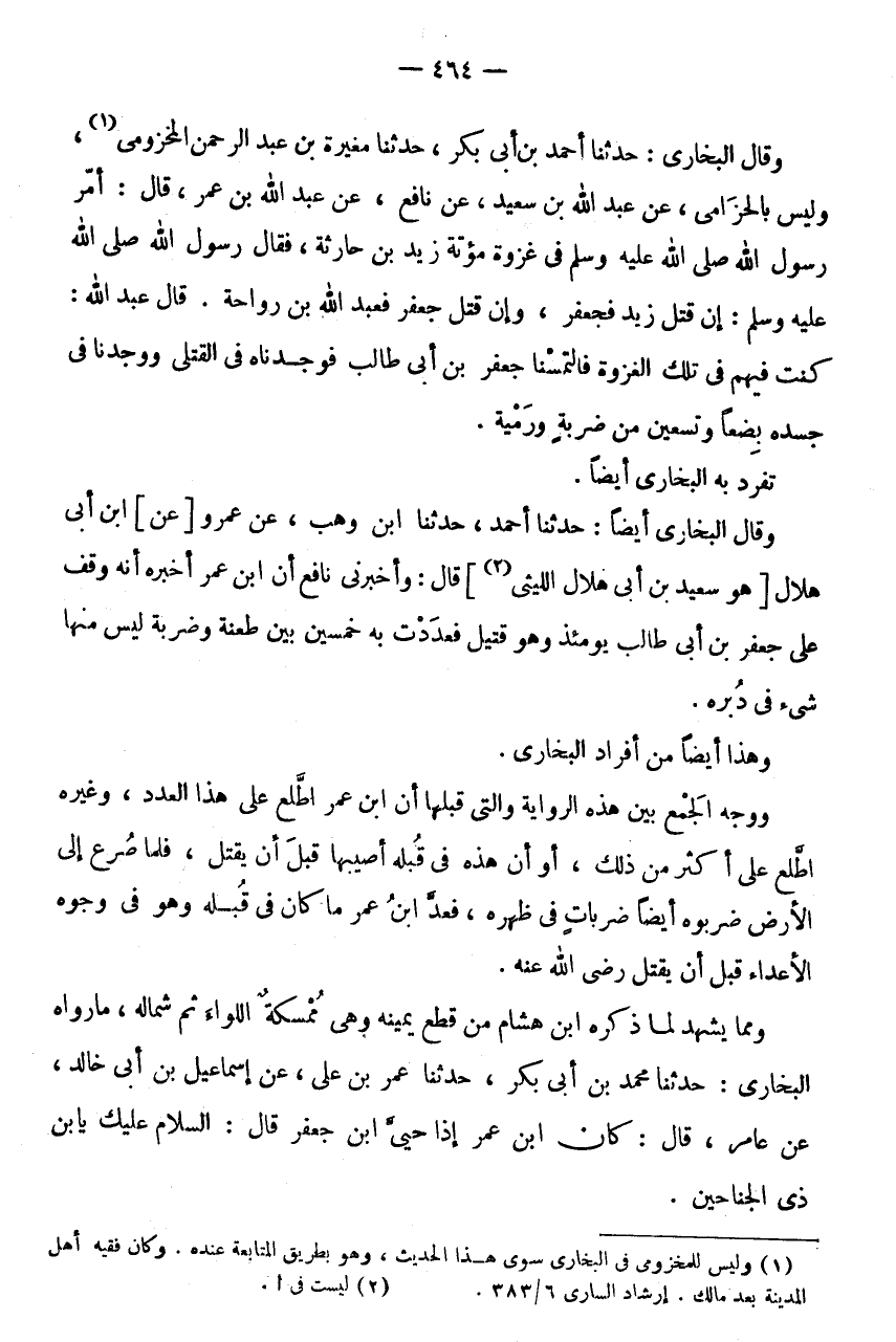 وَقَالَ الْبُخَارِيُّ أَيْضا: حَدثنَا أَحْمد، حَدثنَا ابْنُ وَهْبٍ، عَنْ عَمْرٍو [عَنِ] ابْنِ أَبِي هِلَال [هُوَ سَعِيدُ بْنُ أَبِي هِلَالٍ اللَّيْثِيُّ (2) ] قَالَ: وَأَخْبَرَنِي نَافِعٌ أَنَّ ابْنَ عُمَرَ أَخْبَرَهُ أَنَّهُ وَقَفَ عَلَى جَعْفَرِ بْنِ أَبِي طَالِبٍ يَوْمَئِذٍ وَهُوَ قَتِيلٌ فَعَدَدْتُ بِهِ خَمْسِينَ بَيْنَ طَعْنَةٍ وَضَرْبَةٍ لَيْسَ مِنْهَا شئ فِي دُبُرِهِ.
