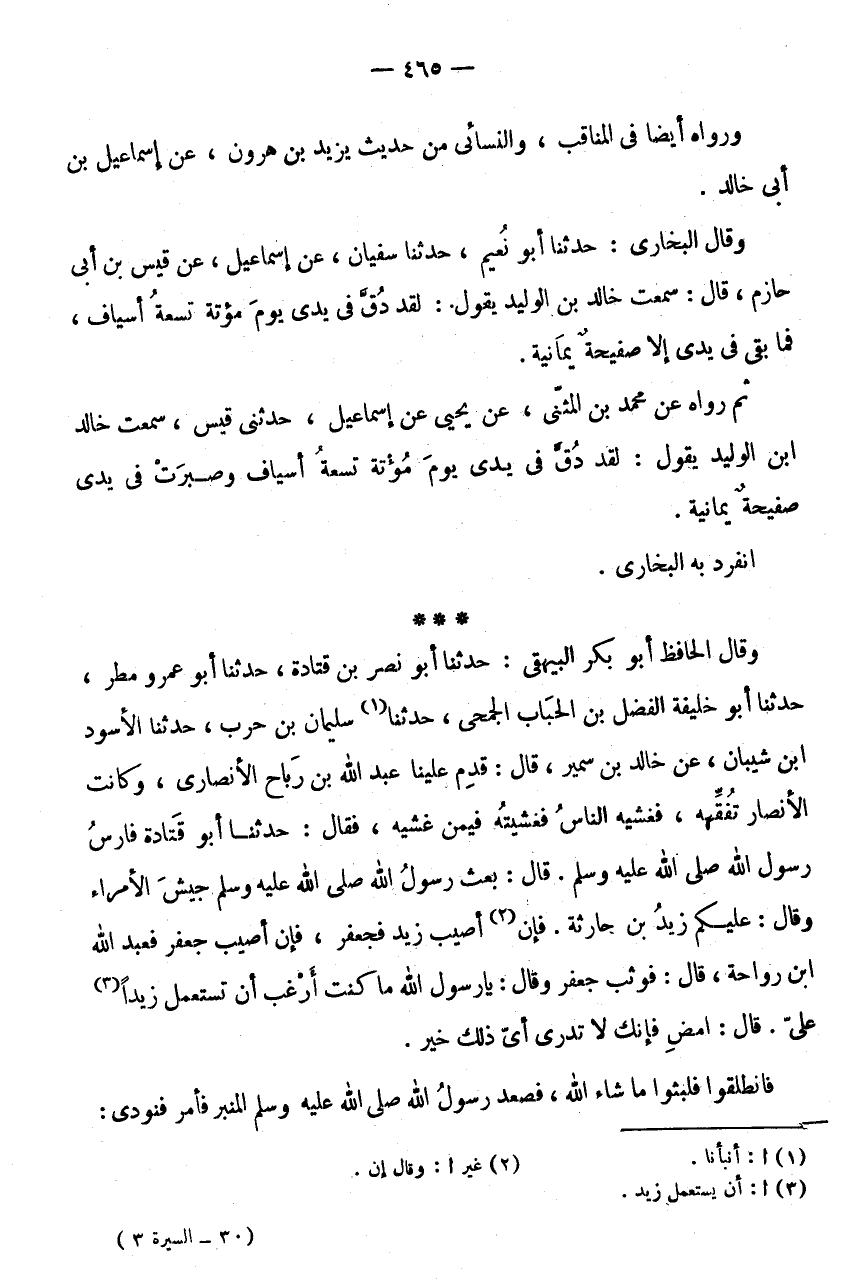 وَقَالَ البُخَارِيّ: حَدثنَا أَبُو نعيم، حَدثنَا سُفْيَانُ، عَنْ إِسْمَاعِيلَ، عَنْ قَيْسِ بْنِ أَبِي حَازِمٍ، قَالَ: سَمِعْتُ خَالِدَ بْنَ الْوَلِيدِ يَقُولُ: لَقَدْ دُقَّ فِي يَدِي يَوْمَ مُؤْتَةَ تِسْعَةُ أَسْيَافٍ، فَمَا بَقِيَ فِي يَدِي إِلَّا صَفِيحَةٌ يَمَانِيَةٌ.