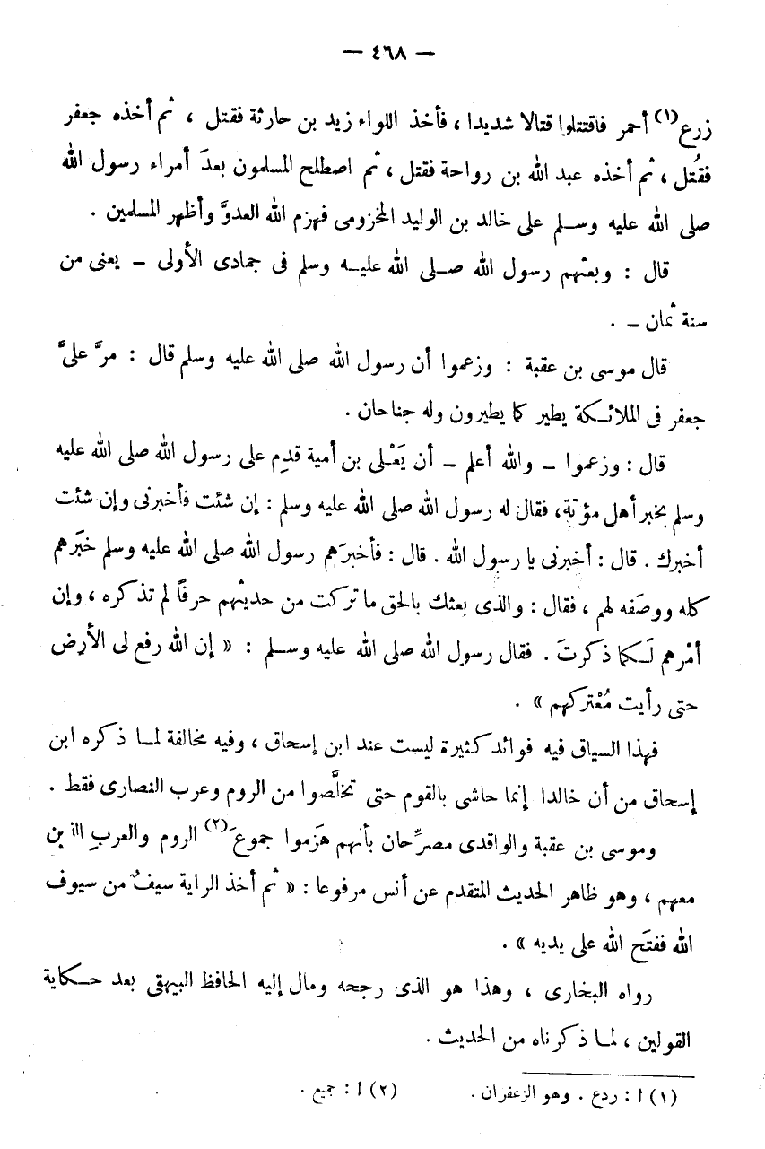 زرع (1) أَحْمَرَ فَاقْتَتَلُوا قِتَالًا شَدِيدًا، فَأَخَذَ اللِّوَاءَ زَيْدُ بْنُ حَارِثَةَ فَقُتِلَ، ثُمَّ أَخَذَهُ جَعْفَرٌ فَقُتِلَ، ثُمَّ أَخَذَهُ عَبْدُ اللَّهِ بْنُ رَوَاحَةَ فَقُتِلَ، ثُمَّ اصْطَلَحَ الْمُسْلِمُونَ بَعْدَ أُمَرَاءِ رَسُولِ اللَّهِ صَلَّى اللَّهُ عَلَيْهِ وَسَلَّمَ عَلَى خَالِدِ بْنِ الْوَلِيدِ الْمَخْزُومِيِّ فَهَزَمَ اللَّهُ الْعَدُوَّ وَأَظْهَرَ الْمُسْلِمِينَ.
