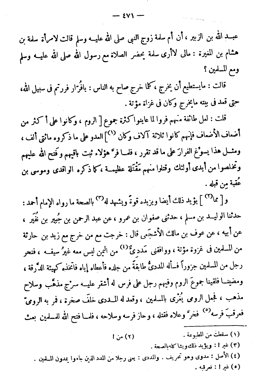 و [مِمَّا (2) ] يُؤَيّد ذَلِك أَيْضا ويزيده قُوَّة وَيشْهد لَهُ (3) بِالصِّحَّةِ مَا رَوَاهُ الْإِمَامُ أَحْمَدُ: حَدَّثَنَا الْوَلِيدُ بْنُ مُسْلِمٍ، حَدَّثَنِي صَفْوَانُ بْنُ عَمْرٍو، عَنْ عَبْدِ الرَّحْمَنِ بْنِ جُبَيْرِ بْنِ نُفَيْرٍ، عَنْ أَبِيهِ، عَنْ عَوْفِ بْنِ مَالِكٍ الْأَشْجَعِيِّ قَالَ: خَرَجْتُ مَعَ مَنْ خَرَجَ مَعَ زَيْدِ بْنِ حَارِثَة من الْمُسلمين فِي غَزْوَة مُؤْتَة، ووافقني مَدَدِيٌّ (4) مِنَ الْيَمَنِ لَيْسَ مَعَهُ غَيْرُ سَيْفِهِ، فَنَحَرَ رَجُلٌ مِنَ الْمُسْلِمِينَ جَزُورًا فَسَأَلَهُ الْمَدَدِيُّ طابقة مِنْ جِلْدِهِ فَأَعْطَاهُ إِيَّاهُ فَاتَّخَذَهُ كَهَيْئَةِ الدَّرَقَةِ، وَمَضَيْنَا فَلَقِينَا جُمُوعَ الرُّومِ وَفِيهِمْ رَجُلٌ عَلَى فَرَسٍ لَهُ أَشْقَرَ عَلَيْهِ سَرْجٌ مُذَهَّبٌ وَسِلَاحٌ مُذَهَّبٌ، فَجَعَلَ الرُّومِيُّ يُغْرِي بِالْمُسْلِمِينَ، وَقَعَدَ لَهُ الْمَدَدِيُّ خَلْفَ صَخْرَةٍ، فَمَرَّ بِهِ الرُّومِيُّ فَعَرْقَبَ فَرَسَهُ (5) فَخَرَّ وَعَلَاهُ فَقَتَلَهُ، وَحَازَ فَرَسَهُ وَسِلَاحَهُ، فَلَمَّا فتح الله للْمُسلمين بعث