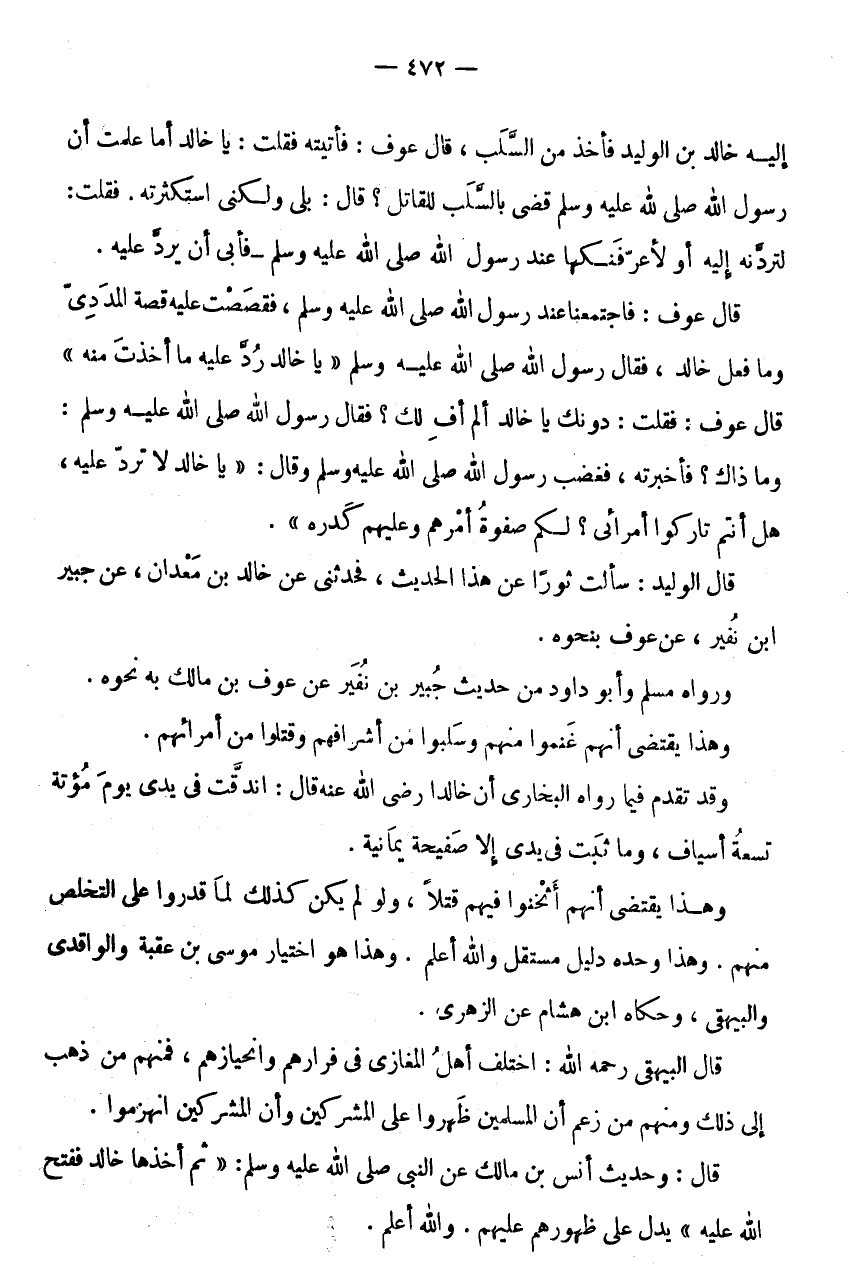 إِلَيْهِ خَالِد بن الْوَلِيد فَأخذ من السَّلَبَ، قَالَ عَوْفٌ: فَأَتَيْتَهُ فَقُلْتُ: يَا خَالِدُ أَمَا عَلِمْتُ أَنَّ رَسُولَ اللَّهِ صَلَّى اللَّهُ عَلَيْهِ وَسَلَّمَ قَضَى بِالسَّلَبِ لِلْقَاتِلِ؟ قَالَ: بَلَى وَلَكِنِّي اسْتَكْثَرْتُهُ.
