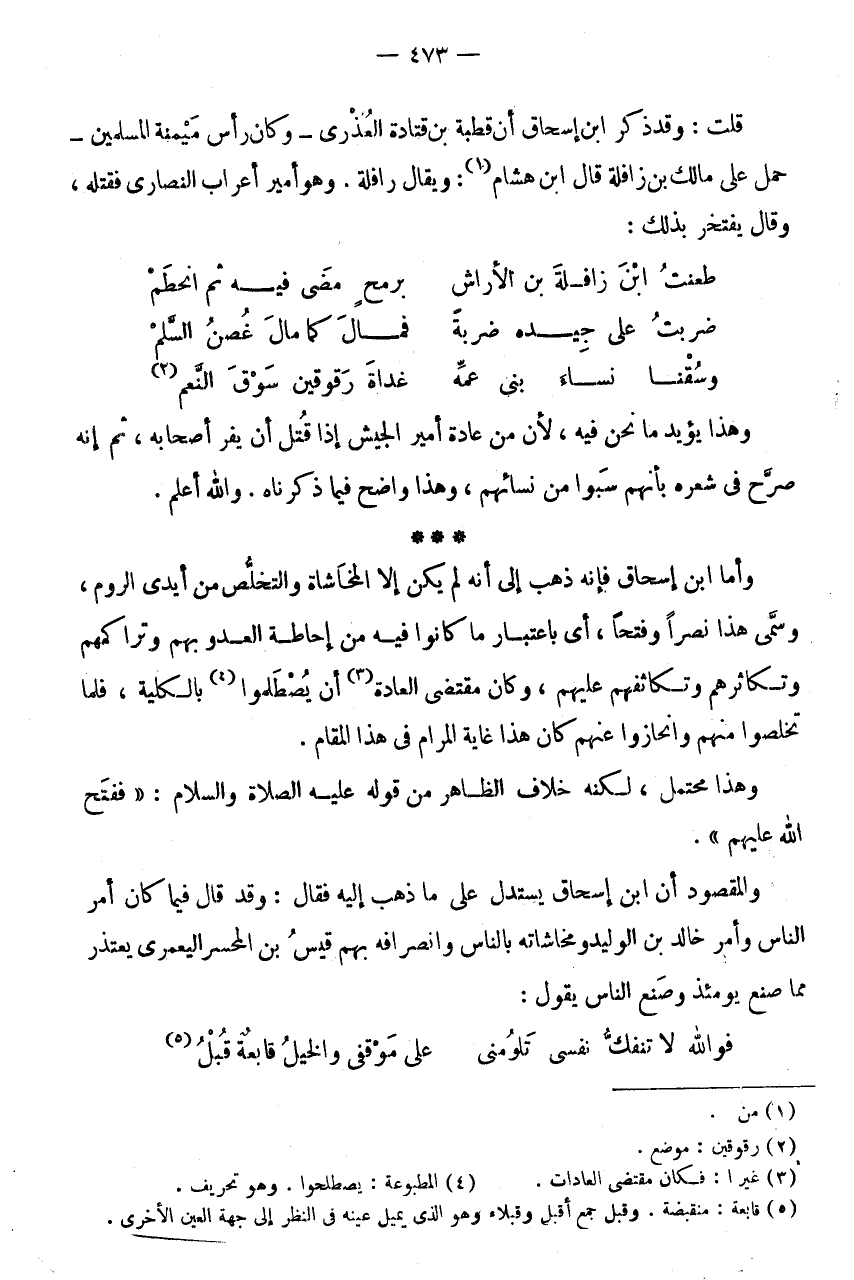 وَهُوَ أَمِيرُ أَعْرَابِ النَّصَارَى فَقَتَلَهُ، وَقَالَ يَفْتَخِرُ بذلك: طعنت ابْن زافلة بْنِ الْإِرَاشِ * بِرُمْحٍ مَضَى فِيهِ ثُمَّ انْحَطَمْ ضَرَبْتُ عَلَى جِيدِهِ ضَرْبَةً * فَمَالَ كَمَا مَالَ غُصْنُ السَّلَمْ وَسُقْنَا نِسَاءَ بَنِي عَمِّهِ * غَدَاةَ رَقُوقَيْنِ سَوْقَ النَّعَمْ (2) وَهَذَا يُؤَيِّدُ مَا نَحْنُ فِيهِ، لِأَنَّ مِنْ عَادَةِ أَمِيرِ الْجَيْشِ إِذَا قُتِلَ أَنْ يَفِرَّ أَصْحَابُهُ، ثُمَّ إِنَّهُ صَرَّحَ فِي شِعْرِهِ بِأَنَّهُمْ سَبَوْا مِنْ نِسَائِهِمْ، وَهَذَا وَاضِحٌ فِيمَا ذَكَرْنَاهُ.