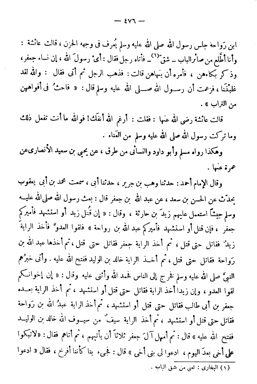 ابْن رَوَاحَةَ جَلَسَ رَسُولُ اللَّهِ صَلَّى اللَّهُ عَلَيْهِ وَسَلَّمَ يُعْرَفُ فِي وَجْهِهِ الْحُزْنُ، قَالَتْ عَائِشَةُ: وَأَنَا أَطَّلِعُ مِنْ صَائِرِ الْبَابِ - شَقٍّ (1) - فَأَتَاهُ رَجُلٌ فَقَالَ: أَيْ رَسُولَ اللَّهِ، إِنَّ نِسَاءَ جَعْفَرٍ، وَذَكَرَ بُكَاءَهُنَّ، فَأَمَرَهُ أَنْ يَنْهَاهُنَّ قَالَتْ: فَذَهَبَ الرَّجُلُ ثُمَّ أَتَى فَقَالَ: وَاللَّهِ لَقَدْ غَلَبْنَنَا، فَزَعَمَتْ أَنَّ رَسُولَ اللَّهِ صَلَّى اللَّهُ عَلَيْهِ وَسَلَّمَ قَالَ: " فَاحْثُ فِي أَفْوَاهِهِنَّ مِنَ التُّرَابِ ".