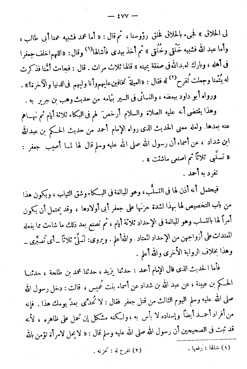 فَأَمَّا الْحَدِيثُ الَّذِي قَالَ الْإِمَامُ أَحْمَدُ: حَدَّثَنَا يَزِيدُ، حَدثنَا مُحَمَّد بن طَلْحَة، حَدثنَا الحكم بن عُيَيْنَة، عَنْ عَبْدِ اللَّهِ بْنِ شَدَّادٍ عَنْ أَسْمَاءَ بنت عُمَيْس، قَالَتْ: دَخَلَ رَسُولُ اللَّهِ صَلَّى اللَّهُ عَلَيْهِ وَسَلَّمَ الْيَوْمَ الثَّالِثَ مِنْ قَتْلِ جَعْفَرٍ فَقَالَ: لَا تُحِدِّي بَعْدَ يَوْمِكِ هَذَا.