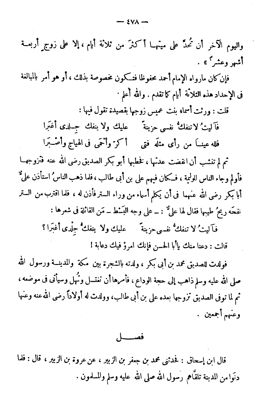 ثُمَّ لَمْ تَنْشَبْ أَنِ انْقَضَتْ عِدَّتُهَا، فَخَطَبَهَا أَبُو بَكْرٍ الصِّدِّيقُ رَضِيَ اللَّهُ عَنْهُ فَتَزَوَّجَهَا فَأَوْلَمَ وَجَاءَ النَّاسُ لِلْوَلِيمَةِ، فَكَانَ فِيهِمْ عَلِيُّ بْنُ أَبِي طَالِبٍ، فَلَمَّا ذَهَبَ النَّاسُ اسْتَأْذَنَ عَلِيٌّ أَبَا بَكْرٍ رَضِيَ اللَّهُ عَنْهُمَا فِي أَنْ يُكَلِّمَ أَسْمَاءَ مِنْ وَرَاءِ السِّتْرِ فَأَذِنَ لَهُ، فَلَمَّا اقْتَرَبَ مِنَ السِّتْرِ نَفَحَهُ رِيحُ طِيبِهَا فَقَالَ لَهَا عَلِيٌّ: - عَلَى وَجْهِ الْبَسْطِ - مَنِ الْقَائِلَةُ فِي شِعْرِهَا: فَآلَيْتُ لَا تَنْفَكُّ نَفْسِي حَزِينَةً * عَلَيْكَ وَلَا يَنْفَكُّ جِلْدِيَ أَغْبَرَا؟ قَالَتْ: دَعْنَا مِنْكَ يَا أَبَا الْحَسَنِ فَإِنَّكَ امْرُؤٌ فِيكَ دُعَابَةٌ! فَوَلَدَتْ لِلصِّدِّيقِ مُحَمَّدَ بْنَ أَبِي بَكْرٍ، وَلَدَتْهُ بِالشَّجَرَةِ بَيْنَ مَكَّةَ وَالْمَدِينَةِ وَرَسُولُ اللَّهِ صَلَّى اللَّهُ عَلَيْهِ وَسَلَّمَ ذَاهِبٌ إِلَى حِجَّةِ الْوَدَاعِ، فَأَمَرَهَا أَنْ تَغْتَسِلَ وَتُهِلَّ وَسَيَأْتِي فِي مَوْضِعِهِ، ثُمَّ لَمَّا تُوُفِّيَ الصِّدِّيقُ تَزَوَّجَهَا بَعْدَهُ عَلِيُّ بْنُ أَبِي طَالِبٍ، وَوَلَدَتْ لَهُ أَوْلَادًا رَضِيَ اللَّهُ عَنْهُ وَعَنْهَا وَعَنْهُمْ أَجْمَعِينَ.