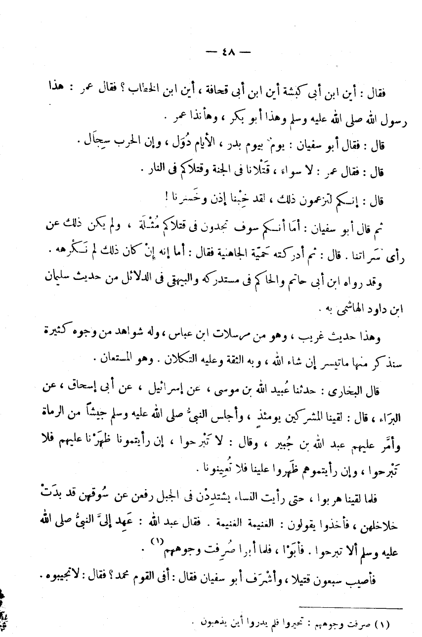 قَالَ: إِنَّكُمْ لَتَزْعُمُونَ ذَلِكَ، لَقَدْ خِبْنَا إِذَنْ وَخَسِرْنَا! ثُمَّ قَالَ أَبُو سُفْيَانَ: أَمَا إِنَّكُمْ سَوْفَ تَجِدُونَ فِي قَتْلَاكُمْ مثلَة، وَلَمْ يَكُنْ ذَلِكَ عَنْ رَأْيِ سَرَاتِنَا.