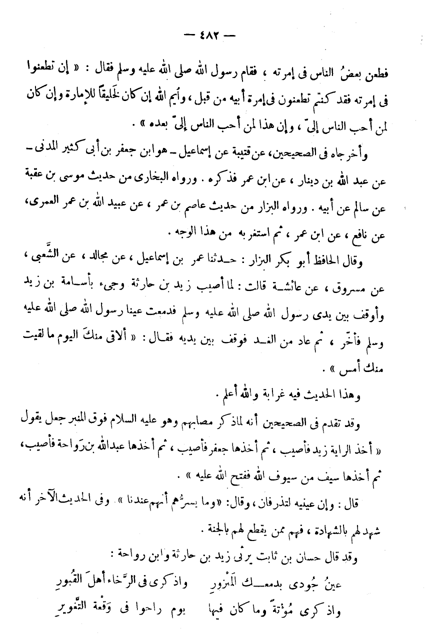 فَطَعَنَ بَعْضُ النَّاسِ فِي إِمْرَتِهِ، فَقَامَ رَسُولُ اللَّهِ صَلَّى اللَّهُ عَلَيْهِ وَسَلَّمَ فَقَالَ: " إِن تَطْعَنُوا فِي إِمْرَتِهِ فَقَدْ كُنْتُمْ تَطْعَنُونَ فِي إِمْرَةِ أَبِيهِ مِنْ قَبْلُ، وَايْمُ اللَّهِ إِنْ كَانَ لَخَلِيقًا لِلْإِمَارَةِ وَإِنْ كَانَ لَمِنْ أَحَبِّ النَّاسِ إِلَيَّ، وَإِنَّ هَذَا لَمِنْ أَحَبِّ النَّاسِ إِلَيَّ بَعْدَهُ ".