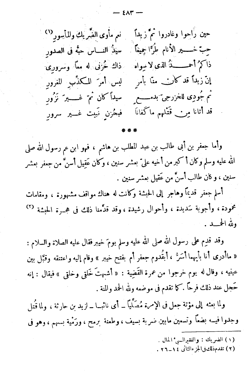 حِينَ رَاحُوا وَغَادَرُوا ثَمَّ زَيْدًا * نِعْمَ مَأْوَى الضَّرِيكِ وَالْمَأْسُورِ (1) حِبَّ خَيْرِ الْأَنَامِ طُرًّا جَمِيعًا * سَيِّدِ النَّاسِ حُبُّهُ فِي الصُّدُورِ ذَاكُمُ أَحْمَدُ الَّذِي لَا سِوَاهُ * ذَاكَ حُزْنِي لَهُ مَعًا وَسُرُورِي إِنَّ زَيْدًا قَدْ كَانَ مِنَّا بِأَمْرٍ * لَيْسَ أَمْرَ الْمُكَذَّبِ الْمَغْرُورِ ثُمَّ جُودِي لِلْخَزْرَجِيِّ بِدَمْعٍ * سَيِّدًا كَانَ ثَمَّ غَيْرَ نَزُورِ قَدْ أَتَانَا مِنْ قَتْلِهِمْ مَا كَفَانَا * فَبِحُزْنٍ نَبِيتُ غَيْرَ سُرُورِ * * * وَأَمَّا جَعْفَرُ بْنُ أَبِي طَالِبِ بْنِ عَبْدِ الْمُطَّلِبِ بْنِ هَاشِمٍ، فَهُوَ ابْنُ عَمِّ رَسُولِ اللَّهِ صَلَّى اللَّهُ عَلَيْهِ وَسَلَّمَ وَكَانَ أكبر من أَخِيه عَلَيْهِ بِعَشْرِ سِنِينَ، وَكَانَ عَقِيلٌ أَسَنَّ مِنْ جَعْفَرٍ بِعَشْرِ سِنِينَ، وَكَانَ طَالِبٌ أَسَنَّ مِنْ عَقِيلٍ بِعَشْرِ سِنِينَ.