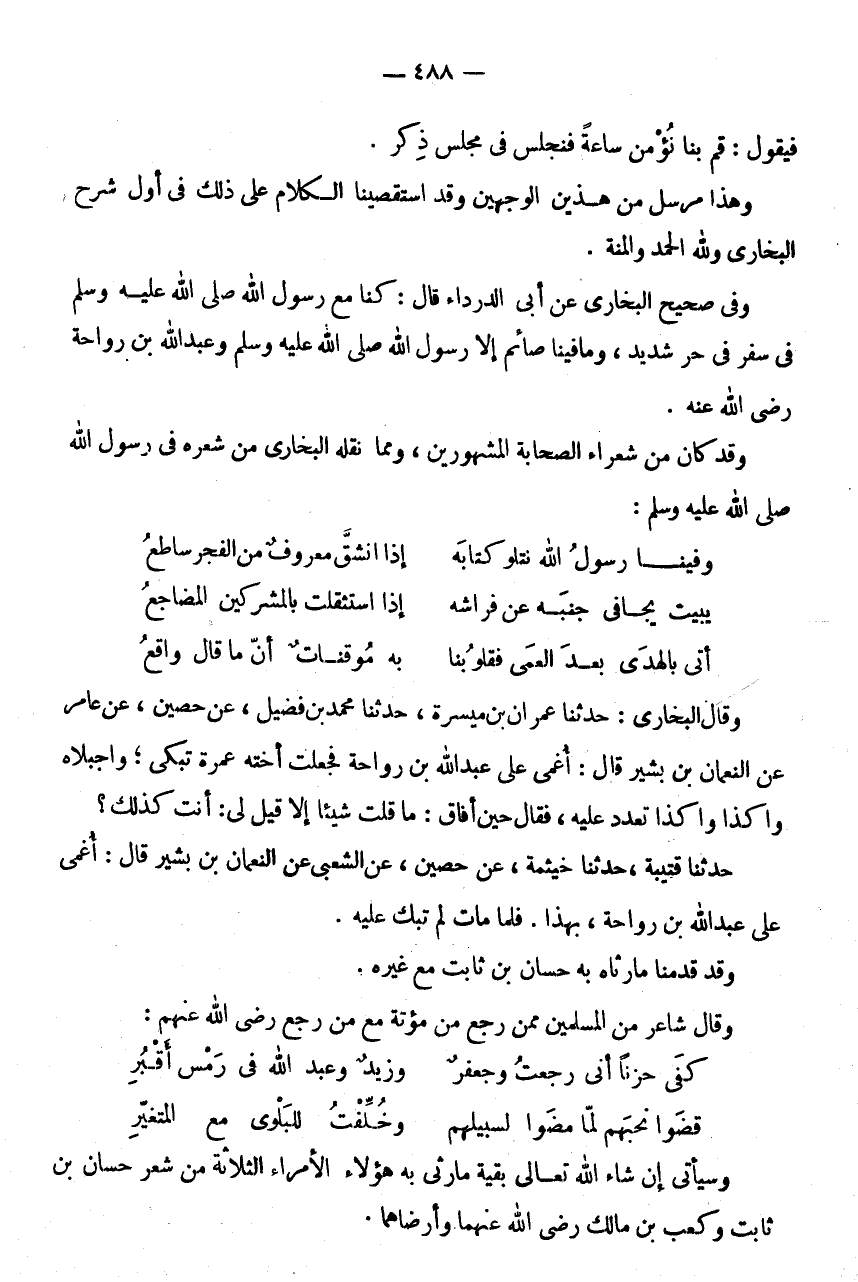أَتَى بِالْهُدَى بَعْدَ الْعَمَى فَقُلُوبُنَا * بِهِ مُوقِنَاتٌ أَنَّ مَا قَالَ وَاقِعُ وَقَالَ البُخَارِيّ: حَدثنَا عمرَان بن ميسرَة، حَدثنَا مُحَمَّدُ بْنُ فُضَيْلٍ، عَنْ حُصَيْنٍ، عَنْ عَامِرٍ عَنِ النُّعْمَانِ بْنِ بَشِيرٍ قَالَ: أُغْمِيَ عَلَى عَبْدِ اللَّهِ بْنِ رَوَاحَةَ فَجَعَلَتْ أُخْتُهُ عَمْرَةُ تَبْكِي، وَاجَبَلَاهُ وَاكَذَا وَاكَذَا تُعَدِّدُ عَلَيْهِ، فَقَالَ حِينَ أَفَاقَ: مَا قُلْتِ شَيْئًا إِلَّا قِيلَ لى: أَنْت كَذَلِك؟ حَدثنَا قُتَيْبَة، حَدثنَا خَيْثَمَة، عَنْ حُصَيْنٍ، عَنِ الشَّعْبِيِّ عَنِ النُّعْمَانِ بْنِ بَشِيرٍ قَالَ: أُغْمِيَ عَلَى عَبْدِ اللَّهِ بْنِ رَوَاحَةَ، بِهَذَا.