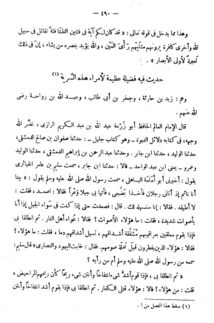 حَدِيثٌ فِيهِ فَضِيلَةٌ عَظِيمَةٌ لِأُمَرَاءِ هَذِهِ السَّرِيَّةِ (1) وَهُمْ: زَيْدُ بْنُ حَارِثَةَ، وَجَعْفَرُ بْنُ أَبِي طَالِبٍ، وَعَبْدُ اللَّهِ بْنُ رَوَاحَةَ رَضِيَ اللَّهُ عَنْهُمْ.