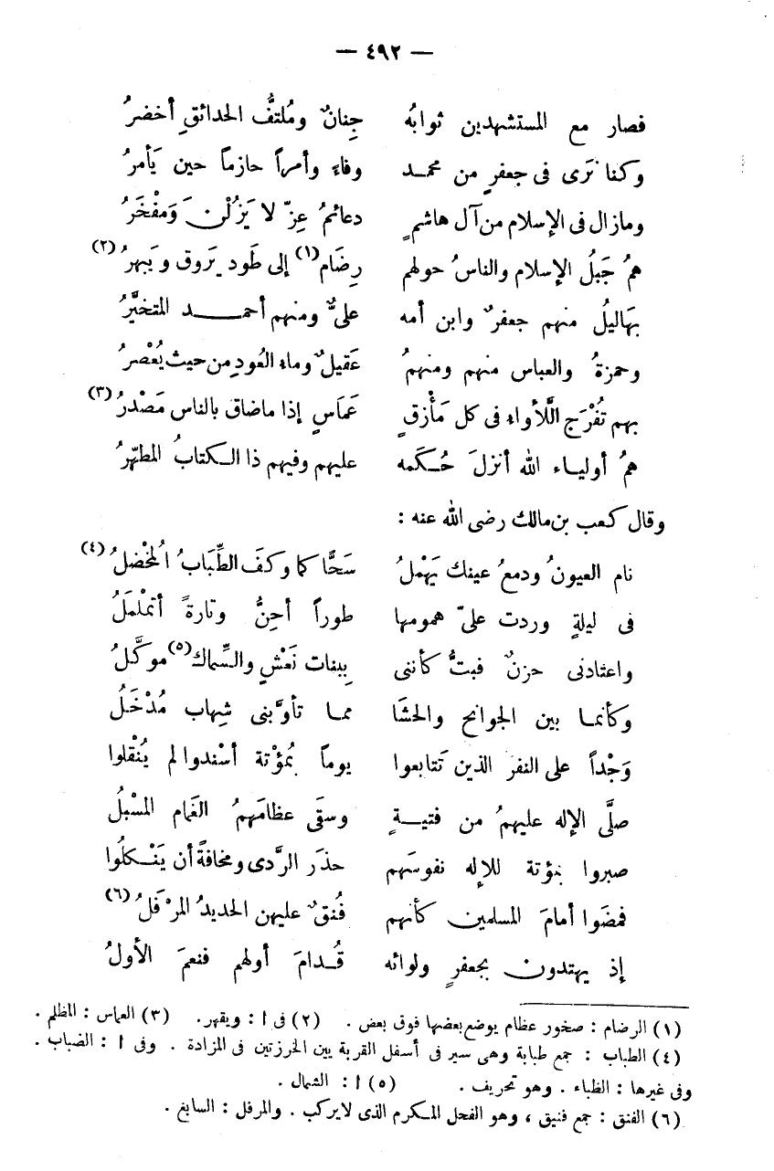 فَصَارَ مَعِ الْمُسْتَشْهِدِينَ ثَوَابُهُ * جِنَانٌ وَمُلْتَفُّ الْحَدَائِقِ أَخْضَرُ وَكُنَّا نَرَى فِي جَعْفَرٍ مِنْ مُحَمَّدٍ * وَفَاءً وَأَمْرًا حَازِمًا حِينَ يَأْمُرُ وَمَا زَالَ فِي الْإِسْلَامِ مِنْ آلِ هَاشِمٍ * دَعَائِمُ عِزٍّ لَا يَزُلْنَ وَمَفْخَرُ هُمُ جَبَلُ الْإِسْلَامِ وَالنَّاسُ حَولهمْ * رضام (1) إِلَى طود يروق ويبهر (2) بِهَالِيلُ مِنْهُمْ جَعْفَرٌ وَابْنُ أُمِّهِ * عَلِيٌّ وَمِنْهُمْ أَحْمَدُ الْمُتَخَيَّرُ وَحَمْزَةُ وَالْعَبَّاسُ مِنْهُمْ وَمِنْهُمُ * عَقِيلٌ وَمَاءُ الْعُودِ مِنْ حَيْثُ يُعْصَرُ بِهِمْ تُفْرَجُ اللَّأْوَاءُ فِي كُلِّ مَأْزِقٍ * عَمَاسٍ إِذَا مَا ضَاقَ بِالنَّاسِ مَصْدَرُ (3) هُمُ أَوْلِيَاءُ اللَّهِ أَنْزَلَ حُكْمَهُ * عَلَيْهِمْ وَفِيهِمْ ذَا الْكِتَابُ الْمُطَهَّرُ وَقَالَ كَعْبُ بْنُ مَالِكٍ رَضِيَ اللَّهُ عَنْهُ: نَامَ الْعُيُونُ وَدَمْعُ عَيْنِكَ يَهْمُلُ * سَحًّا كَمَا وَكَفَ الطِّبَابُ الْمُخْضِلُ (4) فِي لَيْلَةٍ وَرَدَتْ عَلَيَّ هُمُومُهَا * طَوْرًا أَحِنُّ وَتَارَةً أَتَمَلْمَلُ وَاعَتَادَنِي حُزْنٌ فَبِتُّ كَأَنَّنِي * بِبَنَاتِ نَعْشٍ وَالسِّمَاكِ (5) مُوَكَّلُ