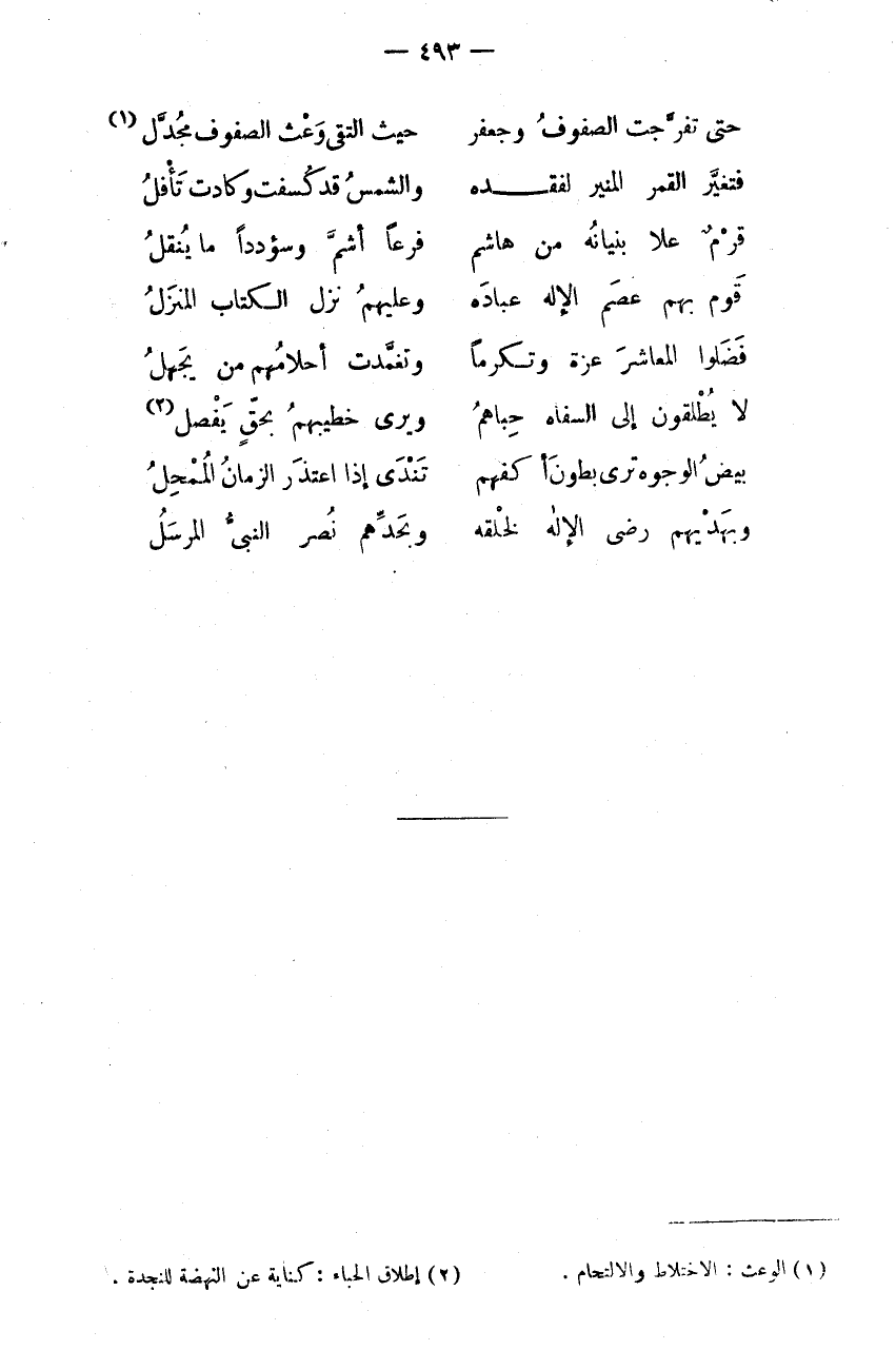 حَتَّى تَفَرَّجَتِ الصُّفُوفُ وَجَعْفَرٌ * حَيْثُ الْتَقَى وَعْثُ الصُّفُوفِ مُجَدَّلُ (1) فَتَغَيَّرَ الْقَمَرُ الْمُنِيرُ لِفَقْدِهِ * وَالشَّمْسُ قَدْ كَسَفَتْ وَكَادَتْ تَأْفِلُ قَرْمٌ عَلَا بُنْيَانُهُ مِنْ هَاشِمٍ * فَرْعًا أَشَمَّ وَسُؤْدَدًا مَا يُنْقَلُ قَوْمٌ بِهِمْ عَصَمَ الِإِلَهُ عِبَادَهُ * وَعَلَيْهِمُ نَزَلَ الْكِتَابُ الْمُنْزَلُ فَضَلُوا الْمَعَاشِرَ عِزَّةً وَتَكُرُّمَا * وَتَغَمَّدَتْ أَحْلَامَهُمْ مَنْ يَجْهَلُ لَا يُطْلِقُونَ إِلَى السَّفَاهِ حُبَاهُمُ * وَيُرَى خَطِيبُهُمُ بِحَقٍّ يَفْصِلُ (2) بِيضُ الْوُجُوهِ تَرَى بُطُونَ أَكُفِّهِمْ * تَنْدَى إِذَا اعْتَذَرَ الزَّمَانُ الممحل وبهديهم رضى الاله لخلقه * وبحدهم نصر النَّبِي الْمُرْسل