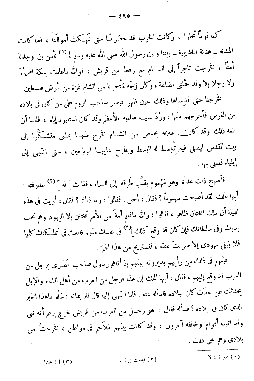 كُنَّا قَوْمًا تُجَّارًا، وَكَانَتِ الْحَرْبُ قَدْ حَصَرَتْنَا حَتَّى نَهَكَتْ أَمْوَالَنَا، فَلَمَّا كَانَتِ الْهُدْنَةُ - هُدْنَةُ الْحُدَيْبِيَةِ - بَيْنَنَا وَبَيْنَ رَسُولِ اللَّهِ صَلَّى اللَّهُ عَلَيْهِ وَسَلَّمَ لَمْ (1) نَأْمَنْ أَنْ وَجَدْنَا أَمْنًا، فَخَرَجْتُ تَاجِرًا إِلَى الشَّامِ مَعَ رَهْطٍ مِنْ قُرَيْشٍ، فَوَاللَّهِ مَا عَلِمْتُ بِمَكَّةَ امْرَأَةً وَلَا رَجُلًا إِلَّا وَقَدْ حَمَّلَنِي بِضَاعَةً، وَكَانَ وَجْهُ مَتْجَرِنَا مِنَ الشَّامِ غَزَّةَ مِنْ أَرْضِ فِلَسْطِينَ.