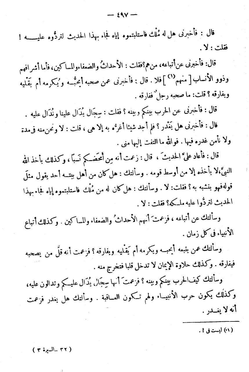 قَالَ: فَأَخْبِرْنِي عَنْ أَتْبَاعِهِ، مَنْ هُمْ؟ فَقُلْتُ: الْأَحْدَاثُ وَالضُّعَفَاءُ وَالْمَسَاكِينُ، فَأَما أَشْرَافهم وذوو الانساب [مِنْهُم (1) ] فَلَا.