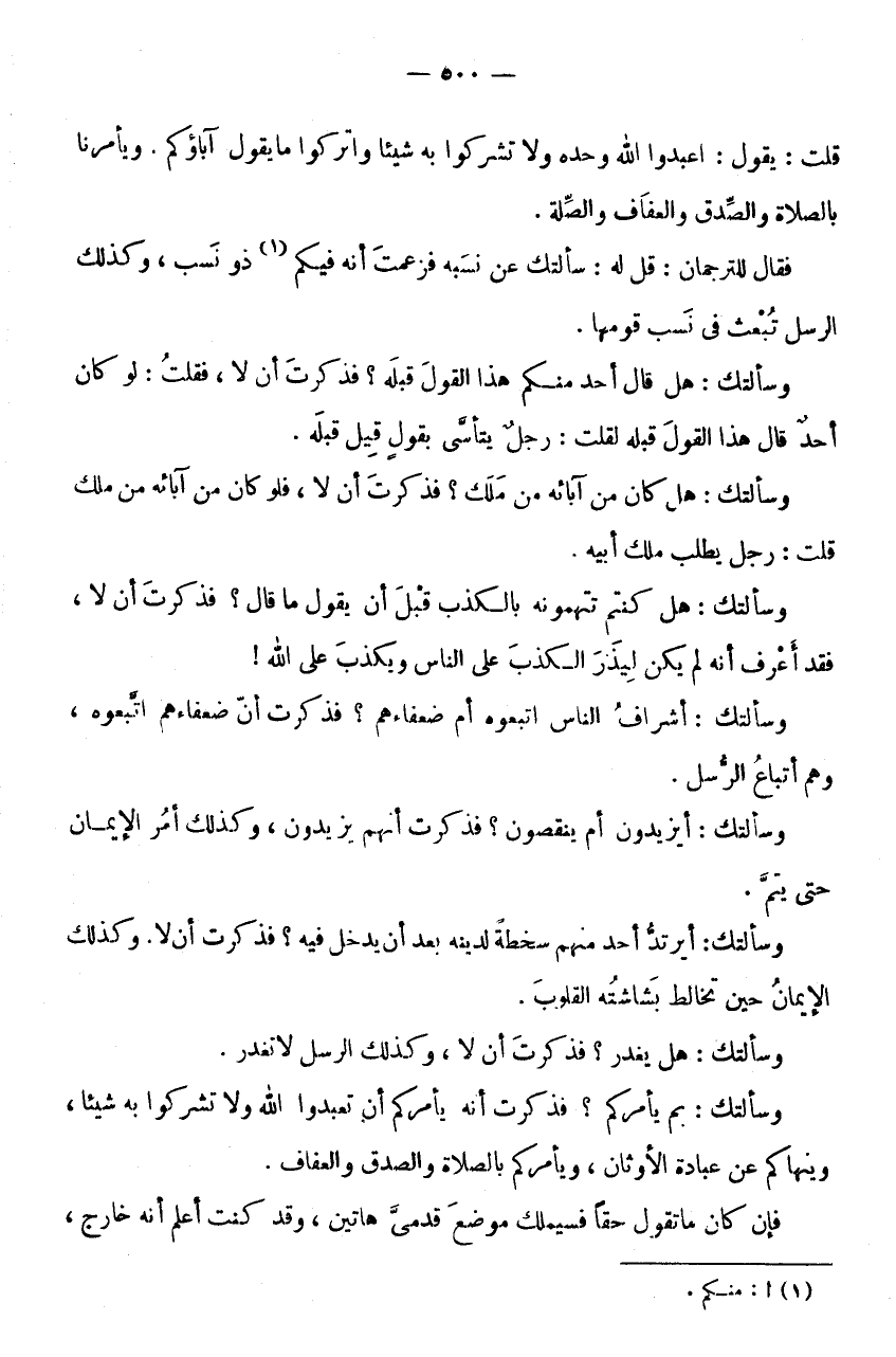 فَقَالَ لِلتُّرْجُمَانِ: قُلْ لَهُ: سَأَلْتُكَ عَنْ نَسَبِهِ فَزَعَمْتَ أَنَّهُ فِيكُمْ (1) ذُو نَسَبٍ، وَكَذَلِكَ الرُّسُلُ تُبْعَثُ فِي نَسَبِ قَوْمِهَا.