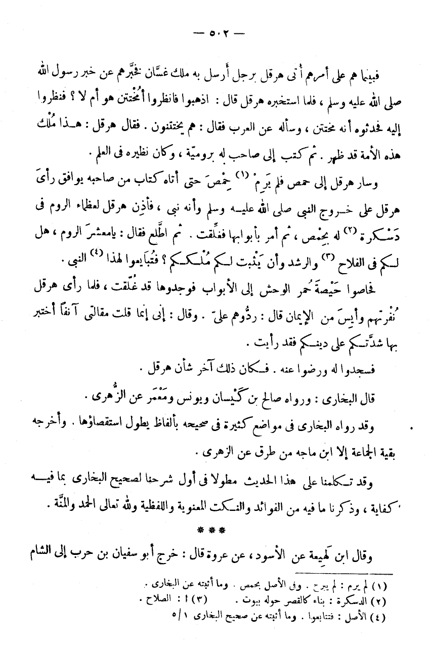 وَسَارَ هِرَقْلُ إِلَى حِمْصَ فَلَمْ يَرِمْ (1) حِمْصَ حَتَّى أَتَاهُ كِتَابٌ مِنْ صَاحِبِهِ يُوَافِقُ رَأْيَ هِرَقْلَ عَلَى خُرُوجِ النَّبِيِّ صَلَّى اللَّهُ عَلَيْهِ وَسَلَّمَ وَأَنَّهُ نَبِيٌّ، فَأَذِنَ هِرَقْلُ لِعُظَمَاءِ الرُّومِ فِي دَسْكَرَةٍ (2) لَهُ بِحِمْصَ، ثُمَّ أَمَرَ بِأَبْوَابِهَا فَغُلِّقَتْ.