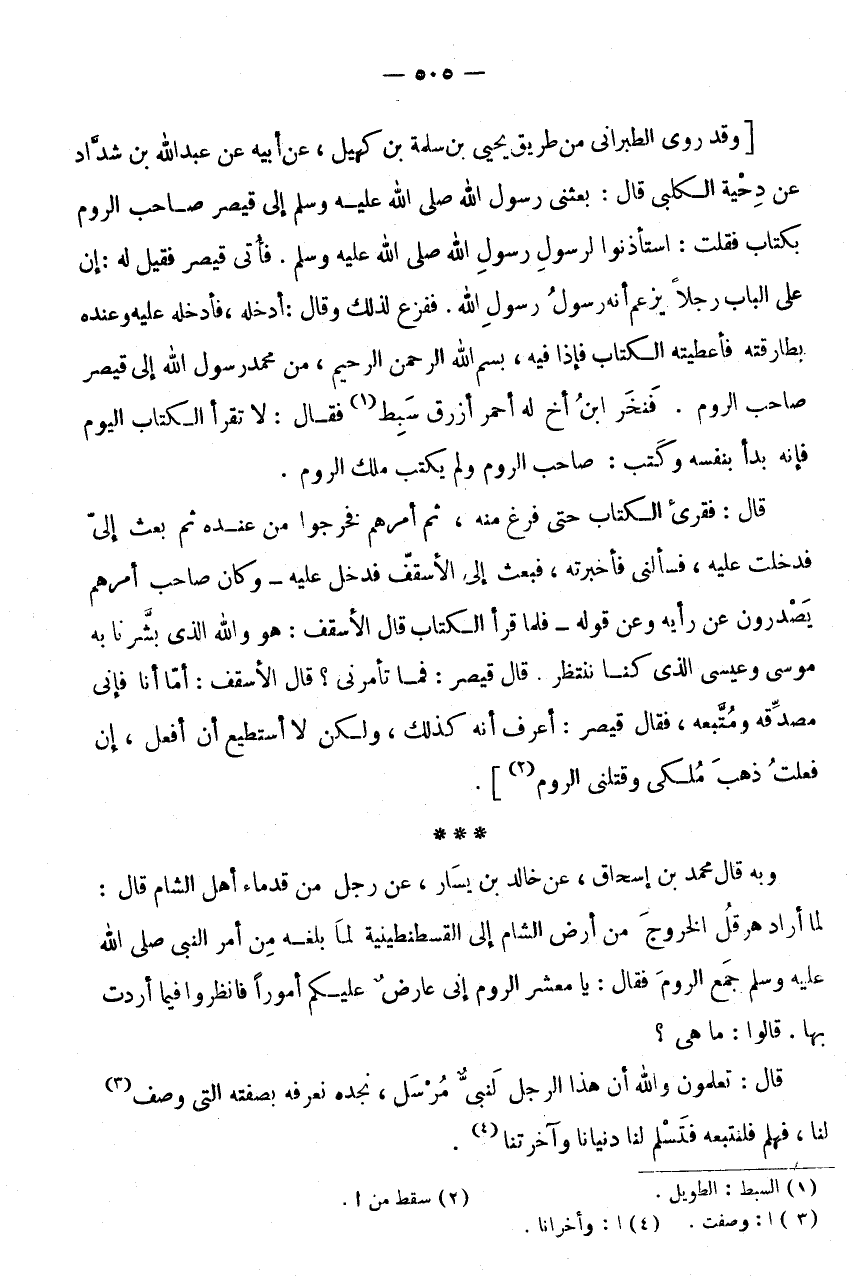 قَالَ قَيْصَرُ: فَمَا تَأْمُرُنِي؟ قَالَ الْأُسْقُفُّ: أَمَّا أَنَا فَإِنِّي مُصَدِّقُهُ وَمُتَّبِعُهُ، فَقَالَ قَيْصَرُ: أَعْرِفُ أَنَّهُ كَذَلِكَ، وَلَكِنْ لَا أَسْتَطِيعُ أَنْ أَفْعَلَ، إِنْ فَعَلْتُ ذَهَبَ مُلْكِي وَقَتَلَنِي الرُّومُ (2) ] .