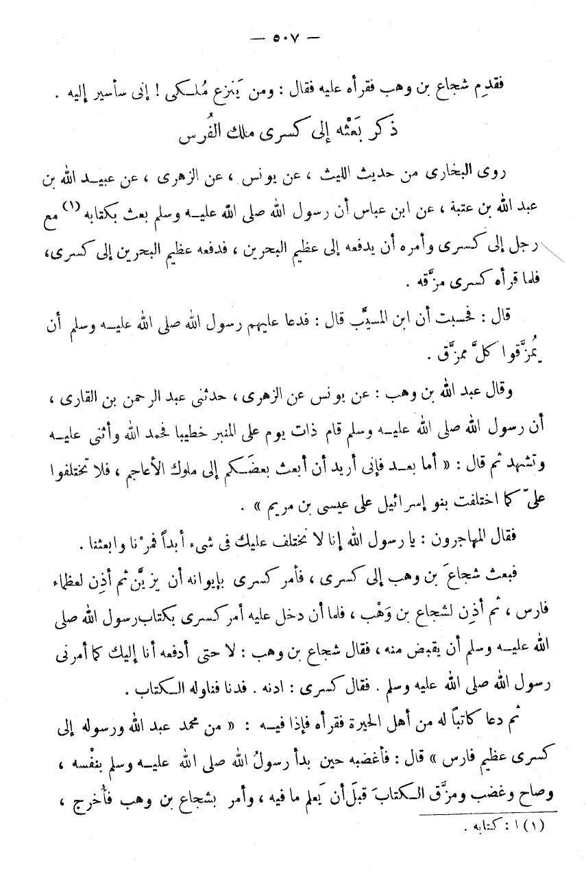 رَوَى الْبُخَارِيُّ مِنْ حَدِيثِ اللَّيْثِ، عَنْ يُونُسَ، عَنِ الزُّهْرِيِّ، عَنْ عُبَيْدِ اللَّهِ بْنِ عَبْدِ اللَّهِ بْنِ عُتْبَةَ، عَنِ ابْنِ عَبَّاسٍ أَنَّ رَسُولَ اللَّهِ صَلَّى اللَّهُ عَلَيْهِ وَسَلَّمَ بَعَثَ بِكِتَابِهِ (1) مَعَ رَجُلٍ إِلَى كِسْرَى وَأَمَرَهُ أَنْ يَدْفَعَهُ إِلَى عَظِيمِ الْبَحْرَيْنِ، فَدَفَعَهُ عَظِيمُ الْبَحْرَيْنِ إِلَى كِسْرَى، فَلَمَّا قَرَأَهُ كِسْرَى مَزَّقَهُ.
