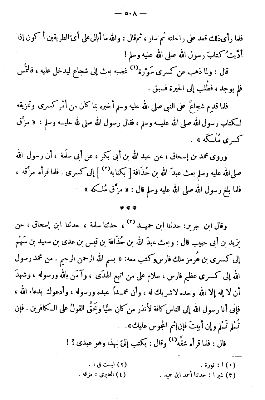 * * * وَقَالَ ابْنُ جَرِيرٍ: حَدَّثَنَا ابْنُ حُمَيْدٍ (3) ، حَدَّثَنَا سَلمَة، حَدثنَا ابْنُ إِسْحَاقَ، عَنْ يَزِيدَ بْنِ أَبِي حَبِيبٍ قَالَ: وَبَعَثَ عَبْدَ اللَّهِ بْنَ حُذَافَةَ بْنِ قَيْسِ بْنِ عَدِيِّ بْنِ سعيد بْنِ سَهْمٍ إِلَى كِسْرَى بْنِ هُرْمُزَ مَلِكِ فَارِسَ وَكَتَبَ مَعَهُ: " بِسْمِ اللَّهِ الرَّحْمَنِ الرَّحِيمِ.